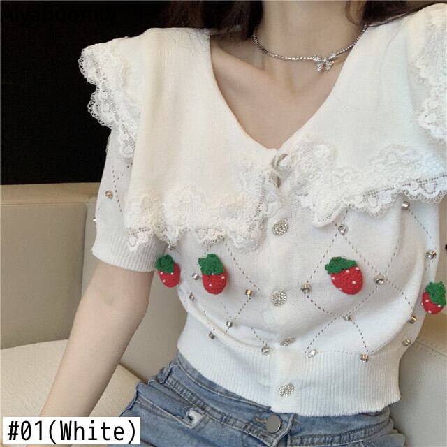 送料無料୨♥୧ スタイルサマーレディースクロップトップ トップス カラーレースニットシャツ ホワイトカーディガン 大人ガーリー スウィート キュート カジュアル 夏物 AOS47640446072