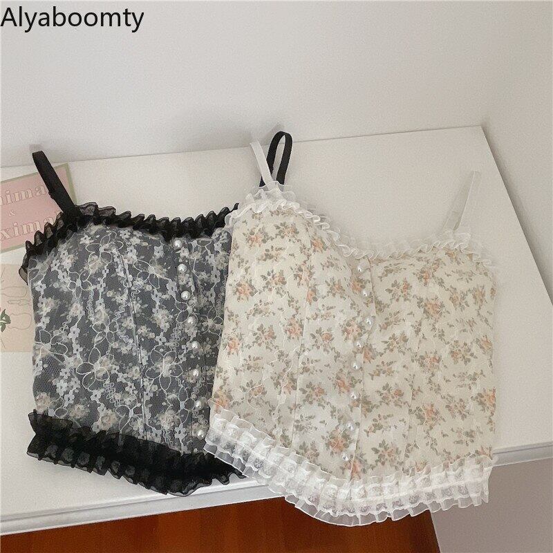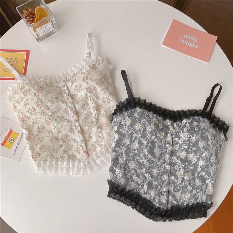 送料無料୨♥୧ サマーレディーススタイルフローラルプリント柄レースクロップトップ トップス ホワイトブラックパールキャミストリートウェア かわいい 夏物 花柄 真珠 AOS421702504