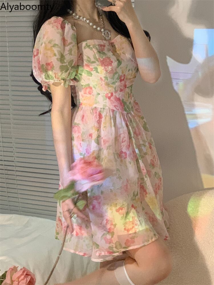 送料無料୨♥୧ サマーレディースミニドレス カラーフローラルプリントスリーブ 大人ガーリー スウィート キュート カジュアル 夏物 花柄 スクウェア AOS38602740767