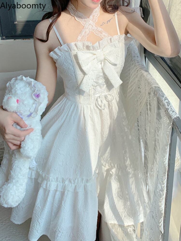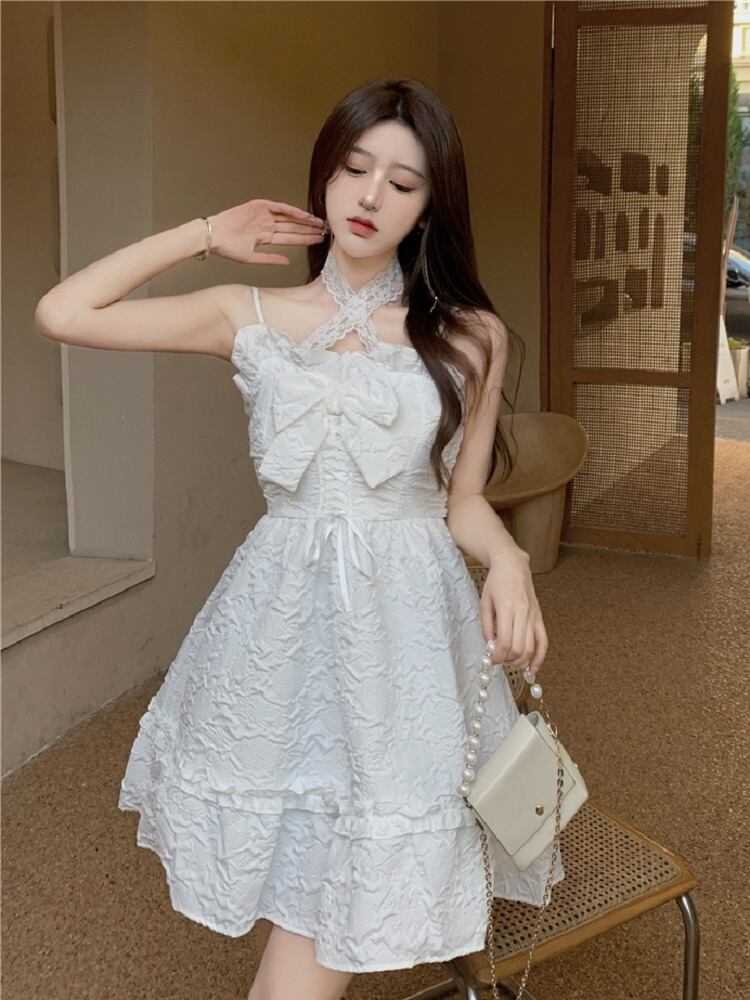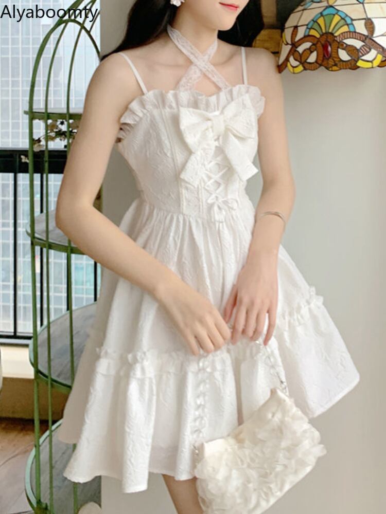 送料無料୨♥୧ サマーレディースホワイトミニドレス クロスリボンジャカードフリル ラッフル 大人ガーリー スウィート キュート カジュアル 夏物 AOS84814628807