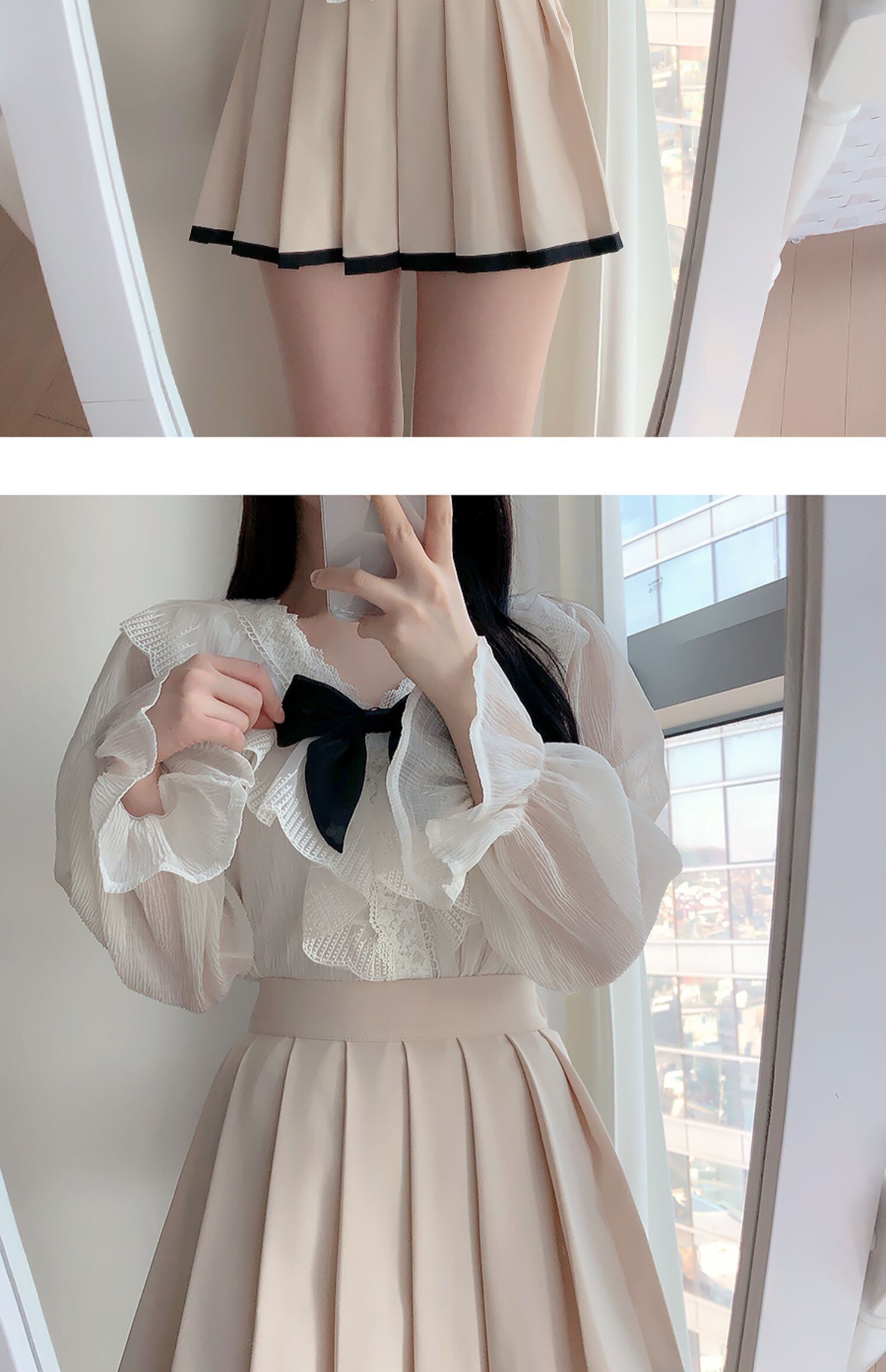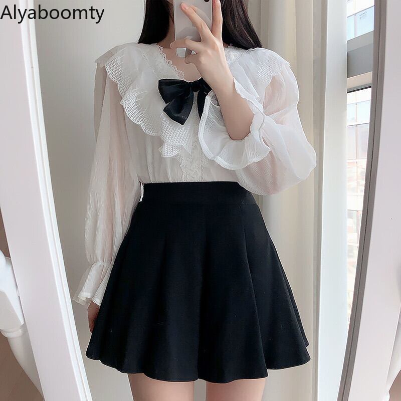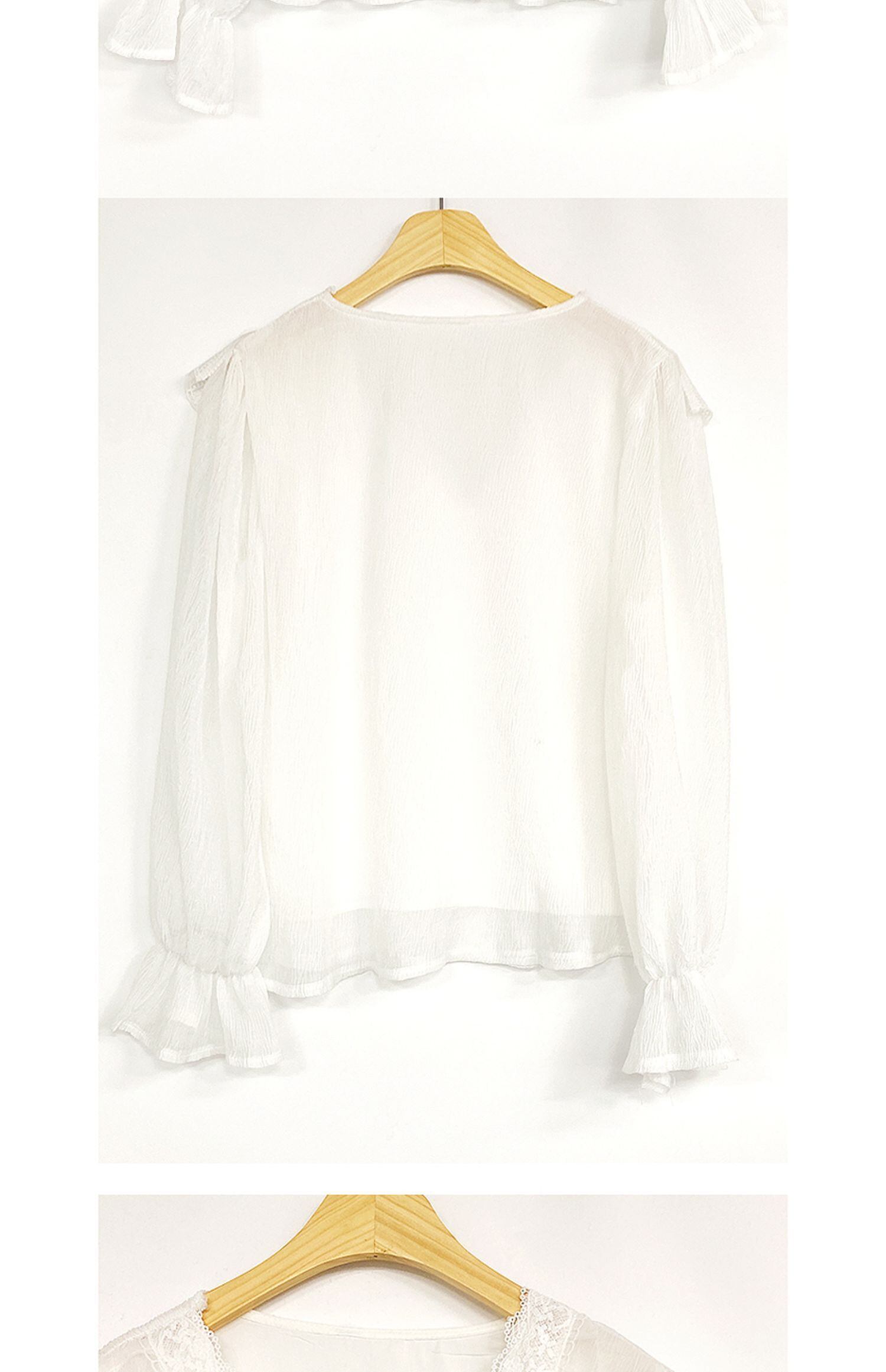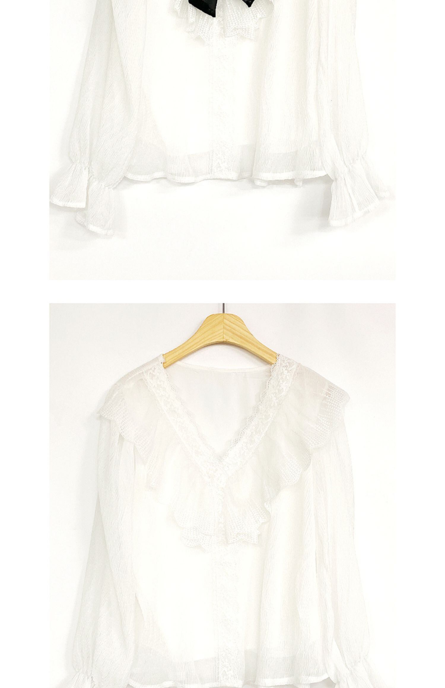 送料無料୨♥୧ スタイルスプリングサマーレディースソリッド ブラウス Vネックリボンホワイトルーズ長袖スリーブフリルシャツ ロング ラッフル 春物 夏物 ソリッドカラー AOS81296539638