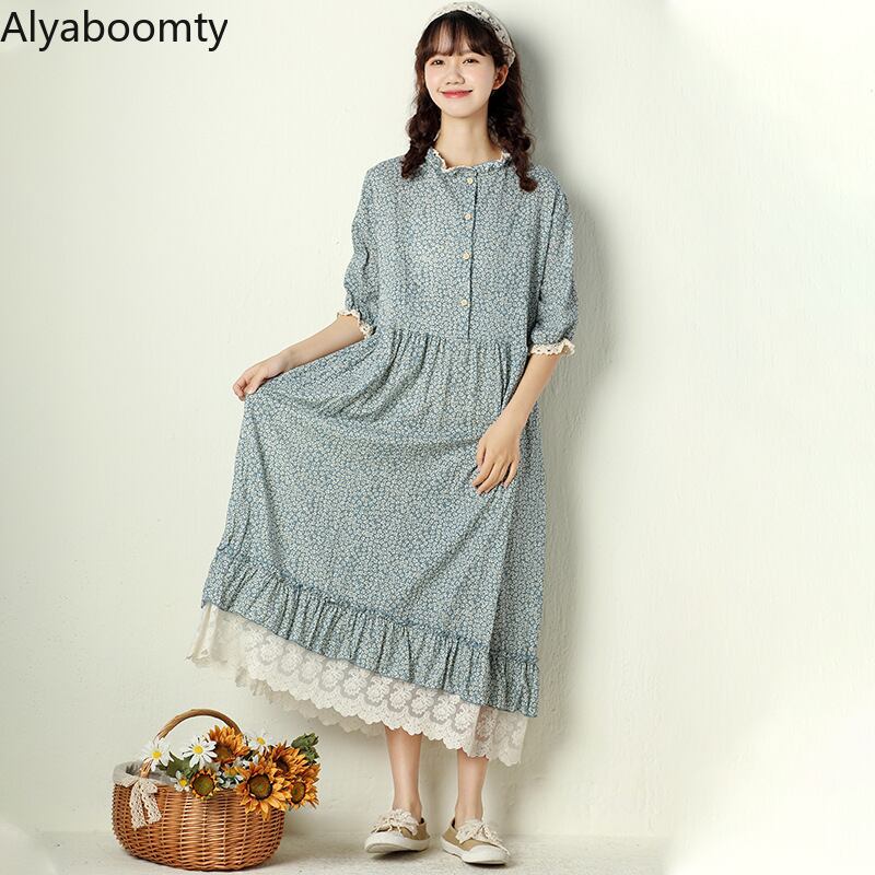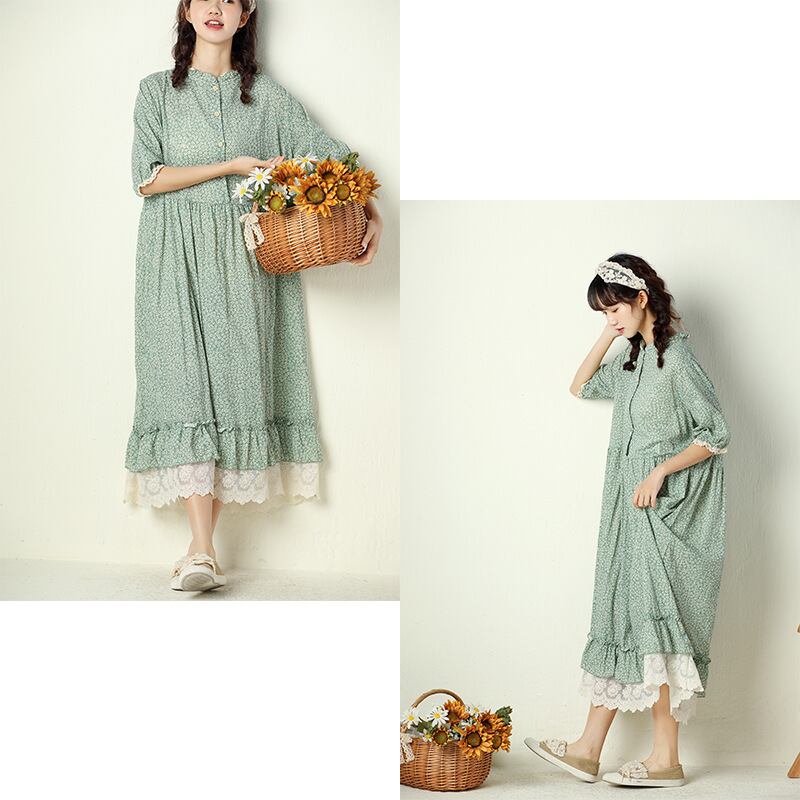 送料無料୨♥୧ サマーレディースミディルーズドレス カラーブルーグリーンフローラル刺繍レースフリルロングドレス ワンピース ピンク コットン ラッフル 大人ガーリー スウィート キュート カジュアル 夏物 花柄 AOS67413473547