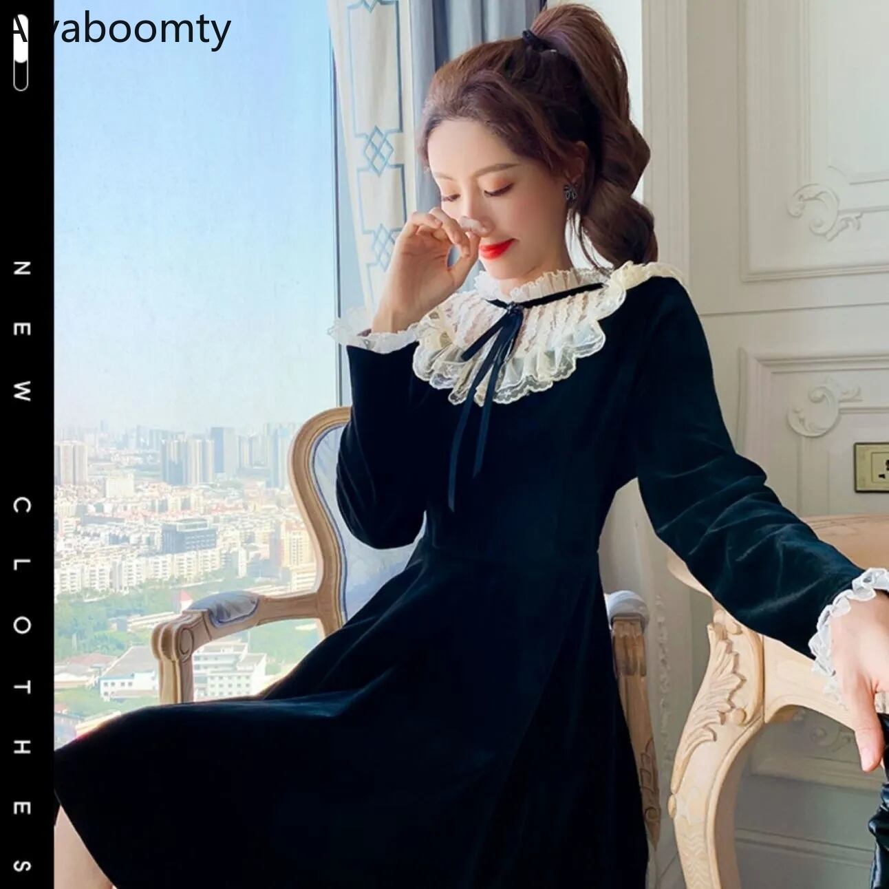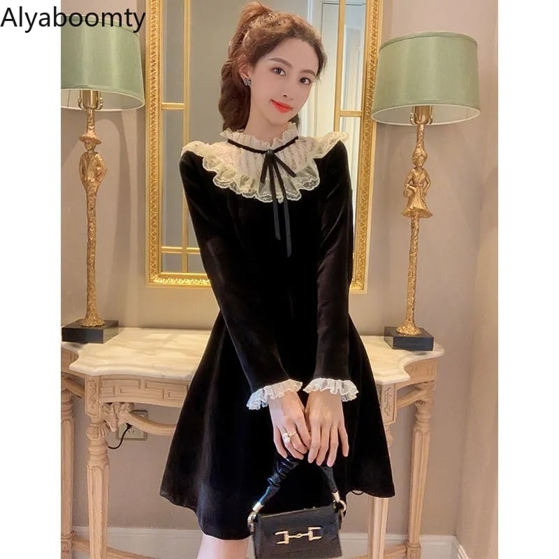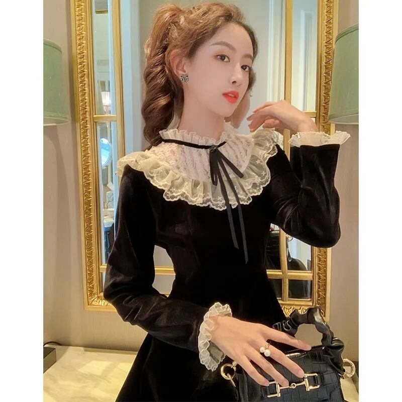 送料無料୨♥୧ スプリングオータムレディースブラックベルベットドレス カラーリボンレースフリルヴィンテージ ラッフル 大人ガーリー スウィート キュート カジュアル 春物 秋物 ビンテージ AOS72025335489