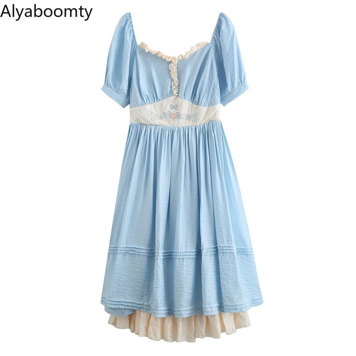 送料無料୨♥୧ サマーレディースフリルドレス カラーフローラル刺繍ブルー ラッフル 大人ガーリー スウィート キュート カジュアル 夏物 花柄 スクウェア AOS96649028272