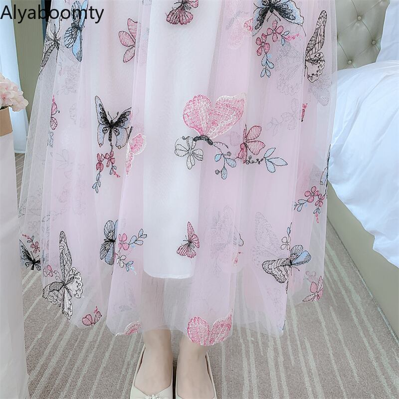 送料無料୨♥୧ サマーレディースミディドレス 刺繍Butterflyデザイン メッシュホワイトノースリーブ ピンク 夏物 AOS2689386430
