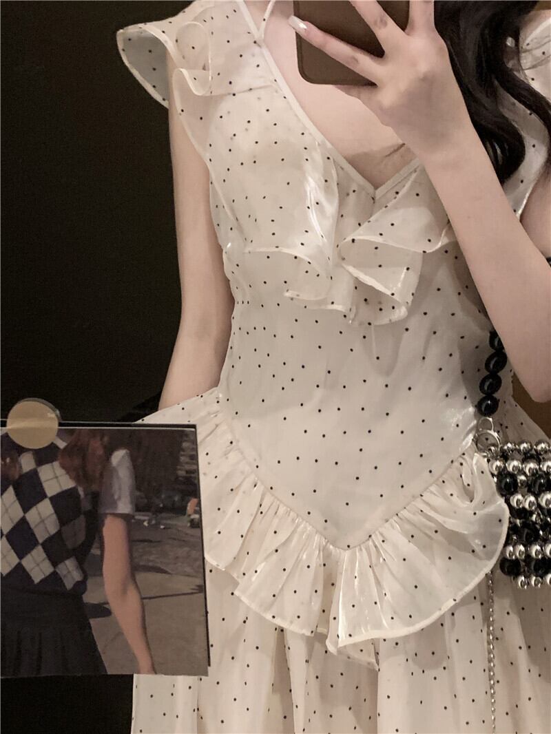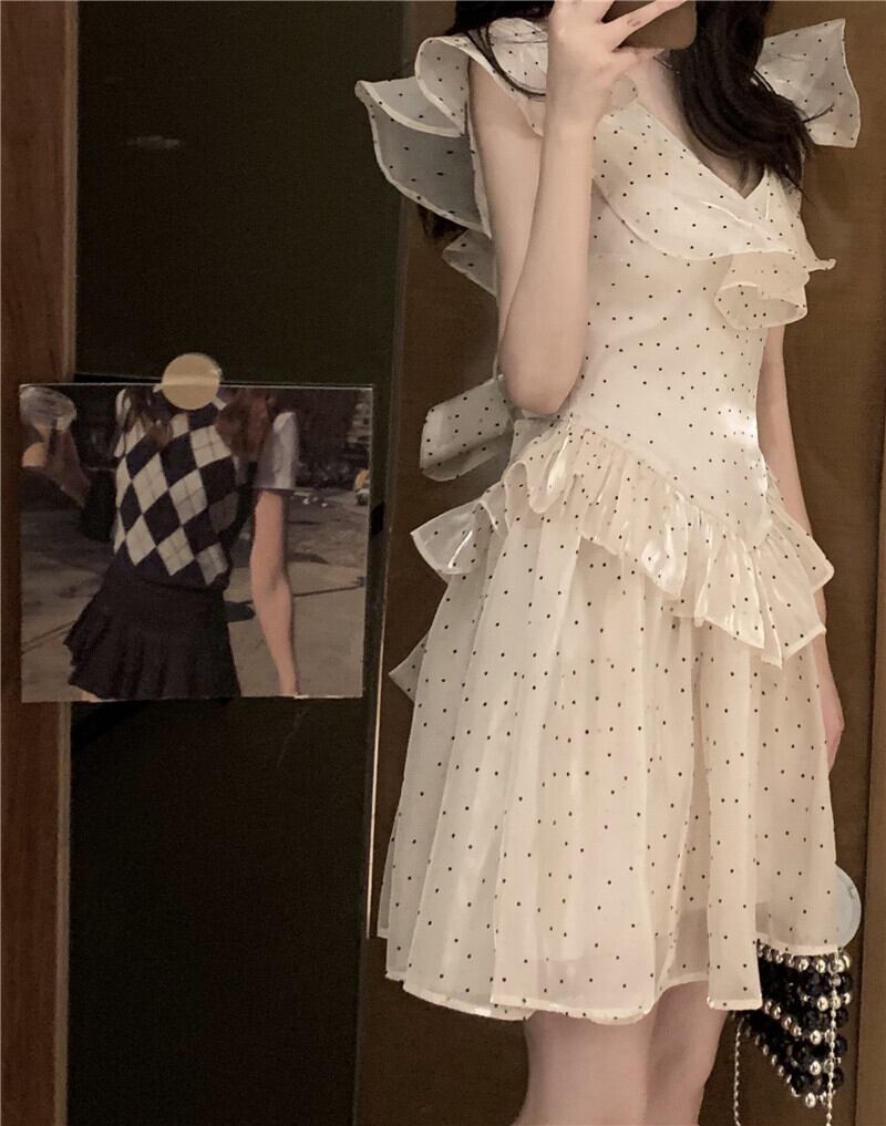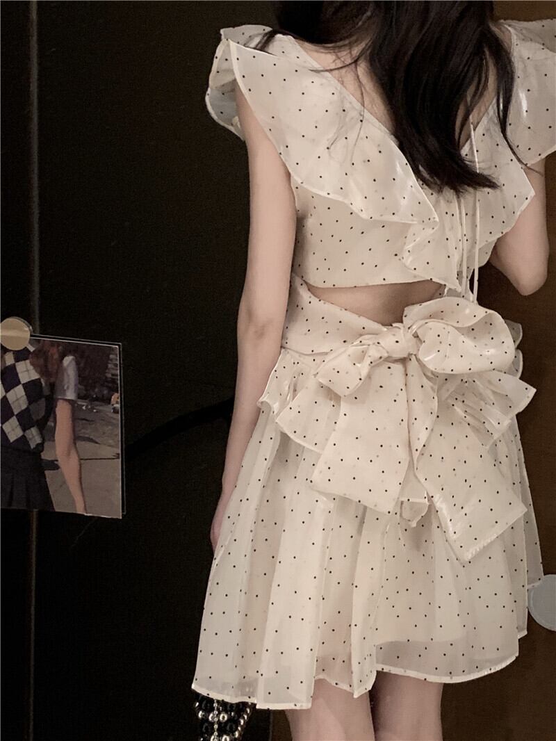 送料無料୨♥୧ サマーレディースミニドレス Vネック水玉フリルバックレス ラッフル 大人ガーリー スウィート キュート カジュアル 夏物 AOS43226101751