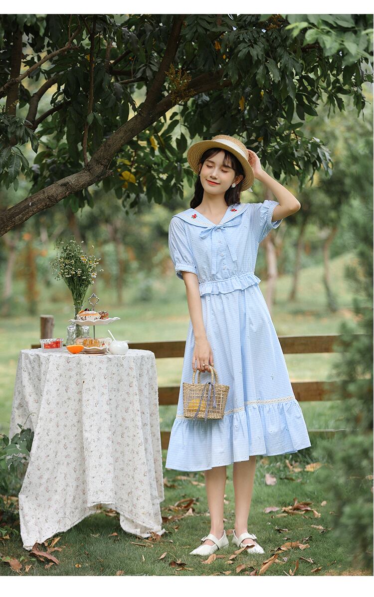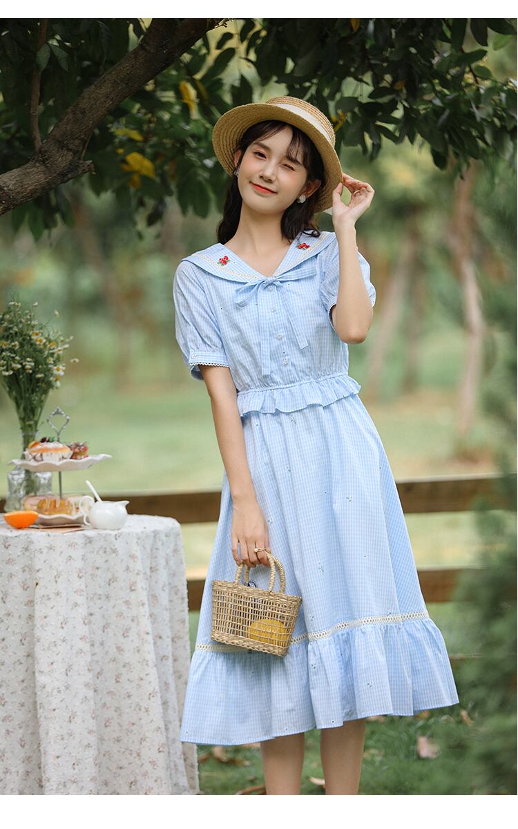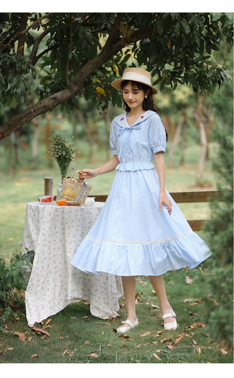 送料無料୨♥୧ サマーレディースブルーミディドレス カラー格子柄フリル ラッフル 大人ガーリー スウィート キュート カジュアル 夏物 AOS1465464057