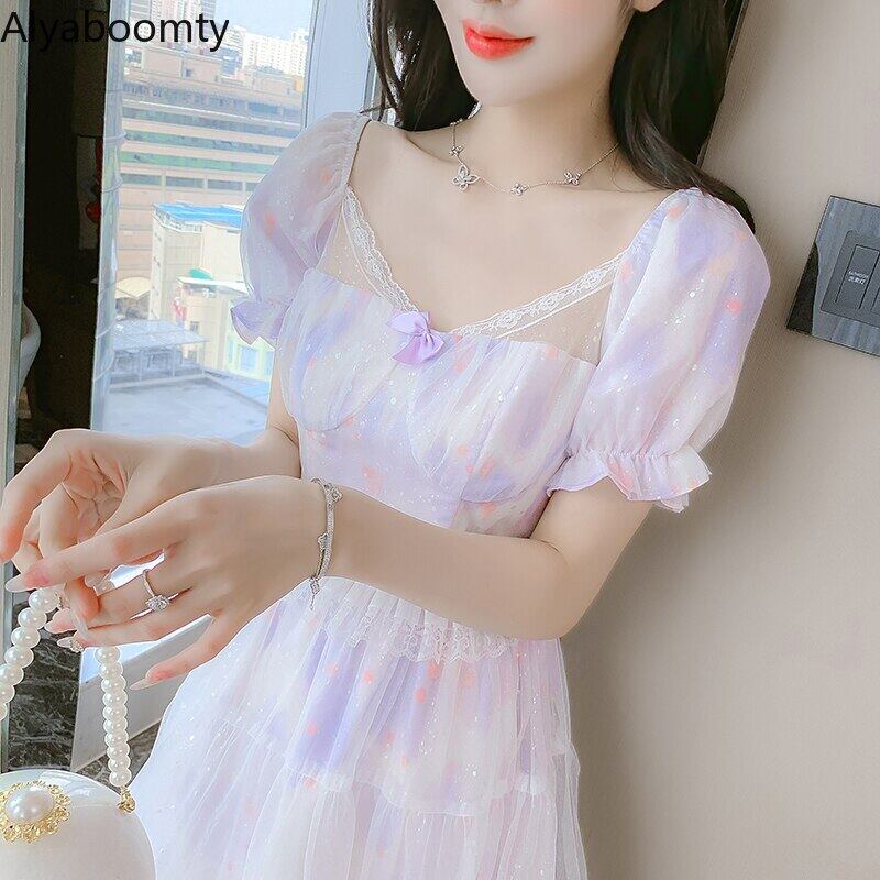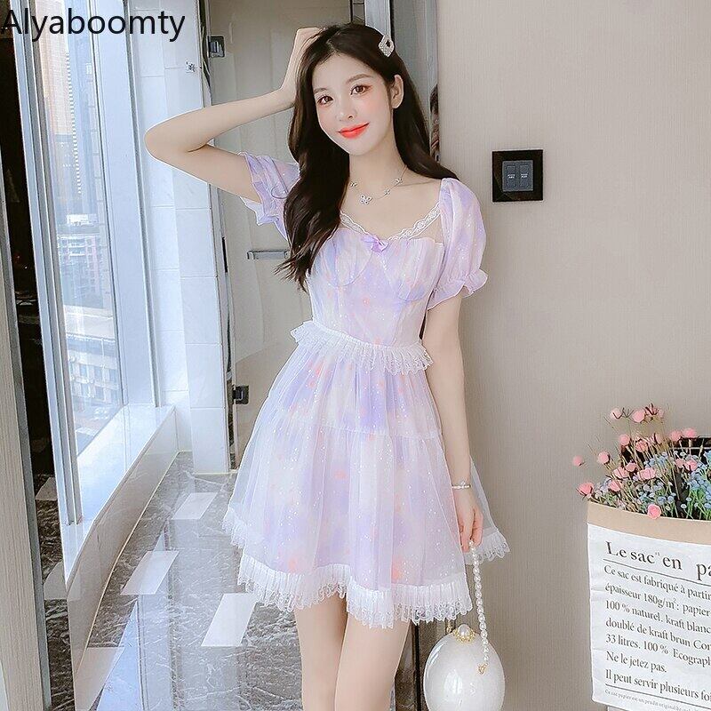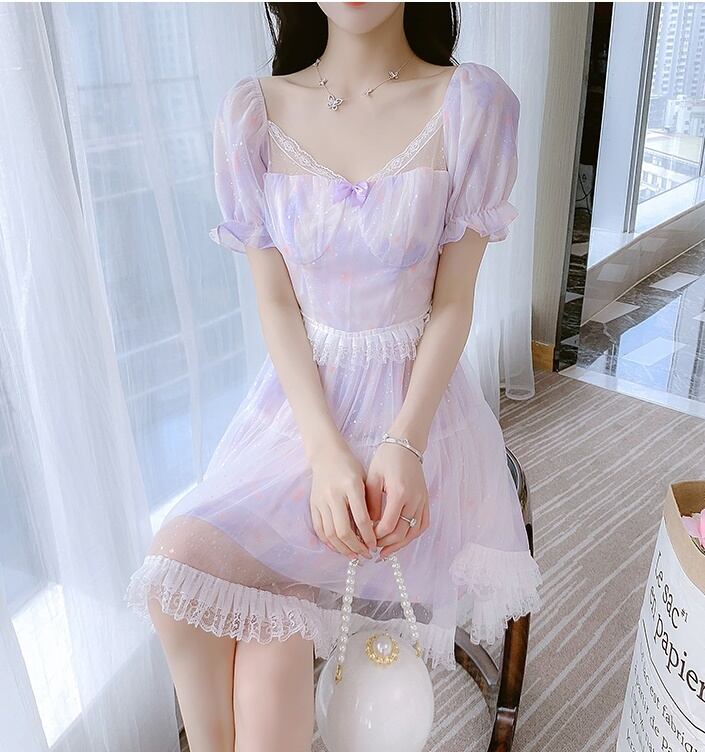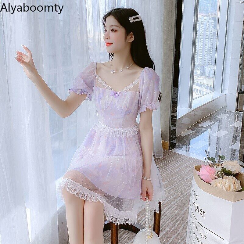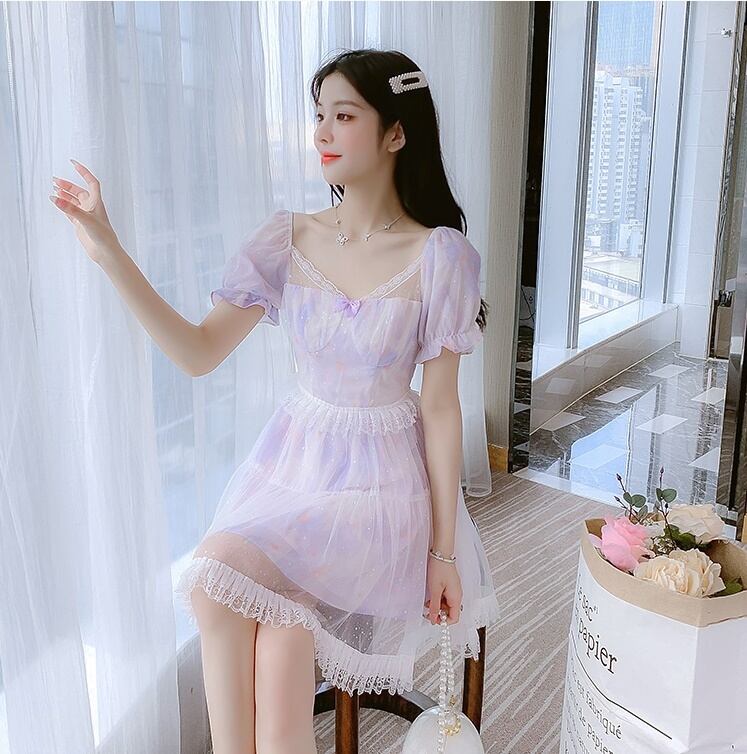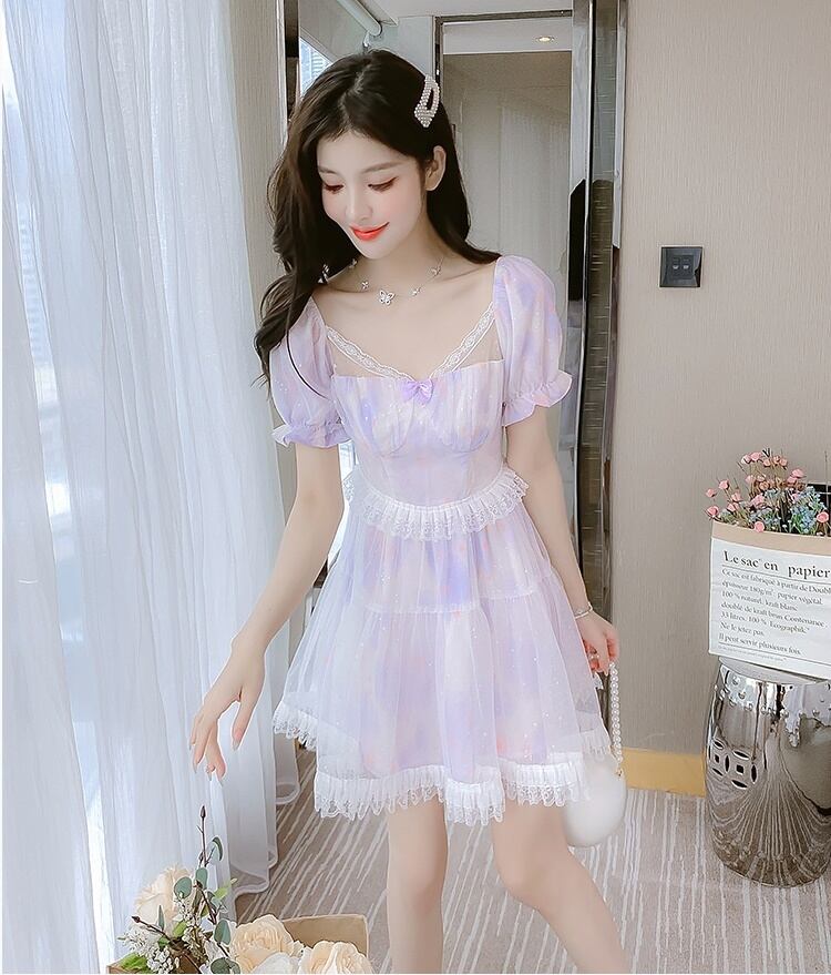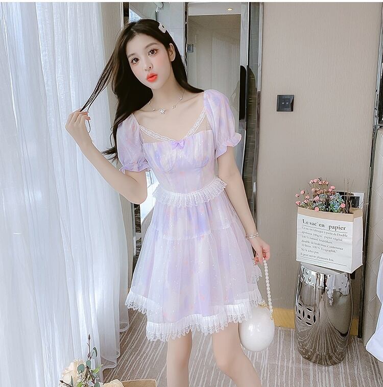 送料無料୨♥୧ サマーレディースミニAラインドレス カラーリボンウェスト半袖スリーブレースフリルドレス ワンピース ショート ハーフスリーブ ラッフル 大人ガーリー スウィート キュート カジュアル 夏物 パープル スクウェア AOS61107221874