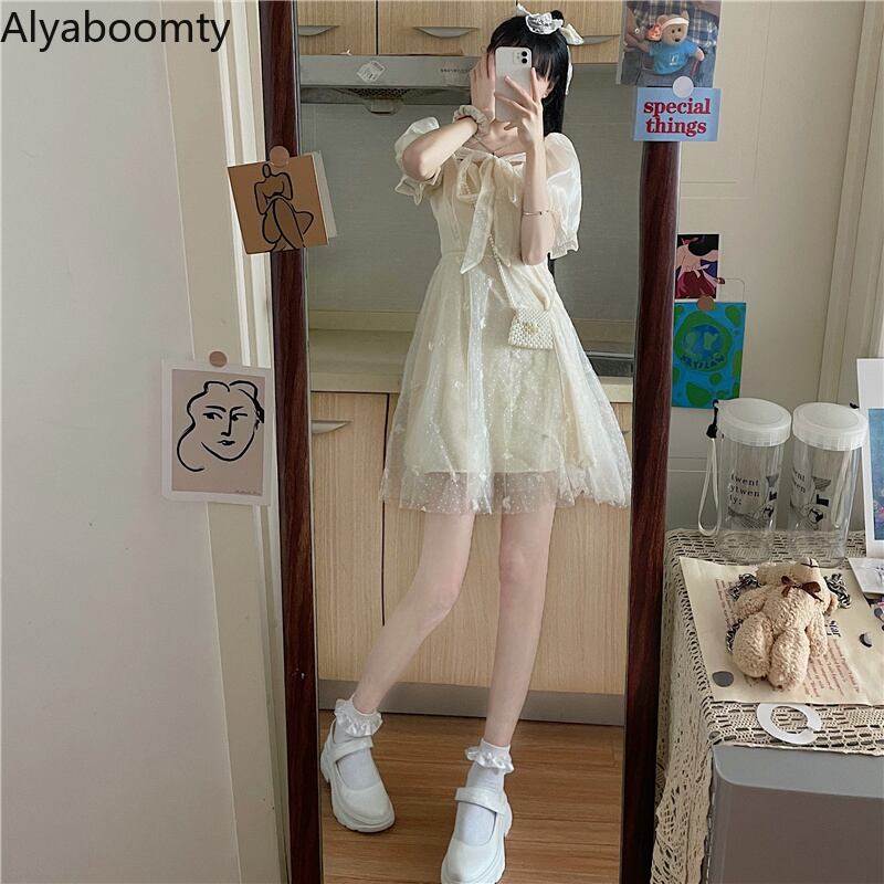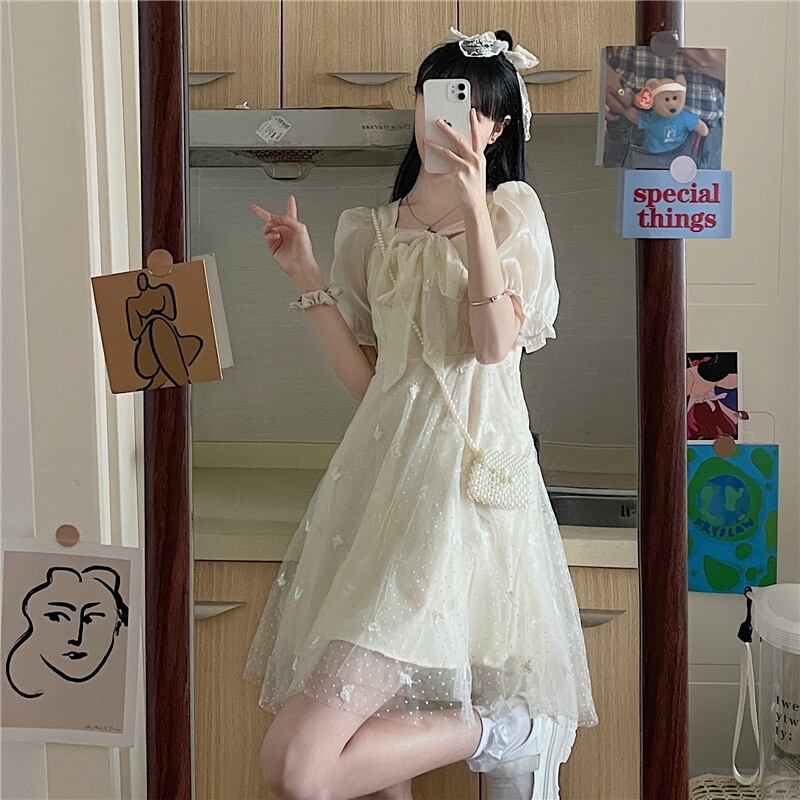 送料無料୨♥୧ サマーレディースドレス カラーリボンButterflyデザイン 刺繍メッシュスリーブドレス ワンピース 大人ガーリー スウィート キュート カジュアル 夏物 スクウェア AOS48256404610