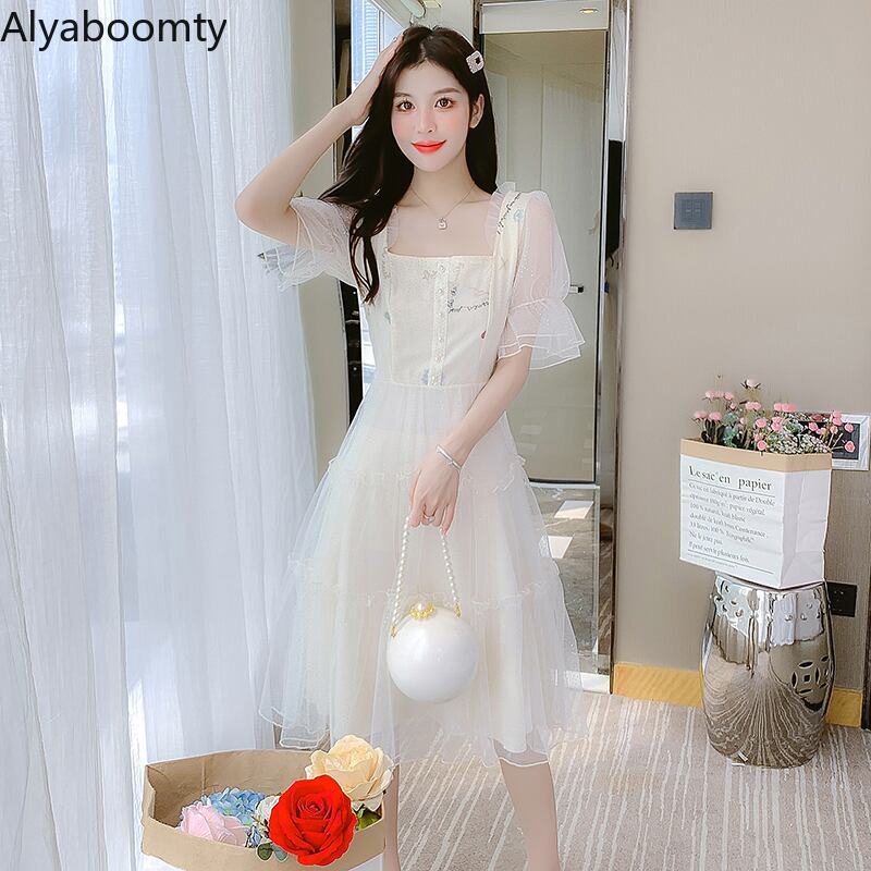 送料無料୨♥୧ サマーレディースドレス カラーフローラル刺繍メッシュスリーブフリル フレアスリーブ ラッフル 大人ガーリー スウィート キュート カジュアル 夏物 花柄 スクウェア AOS46726568436