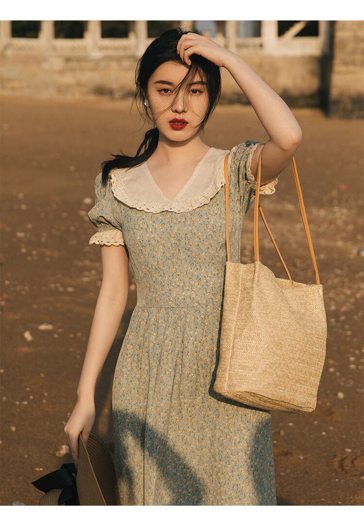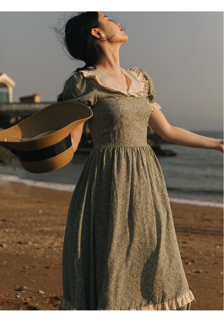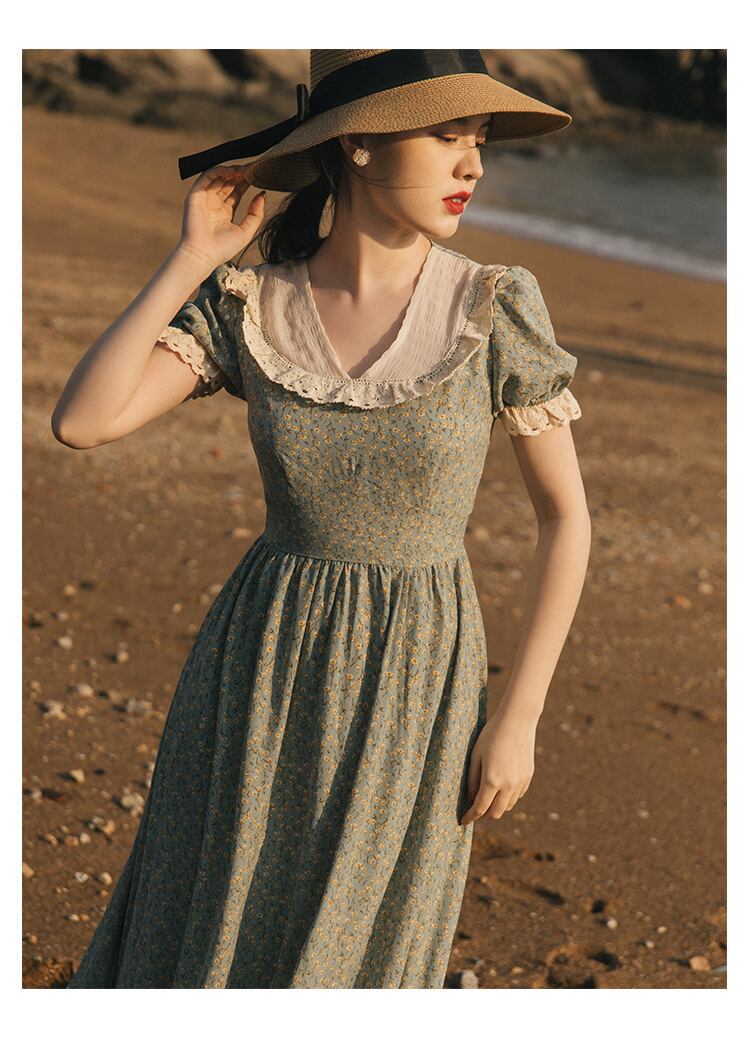 送料無料୨♥୧ サマーレディースAラインロングドレス カラーフローラルプリントシフォンスリーブレースフリルヴィンテージ ラッフル 大人ガーリー スウィート キュート カジュアル 夏物 花柄 スクウェア ビンテージ AOS54106187405