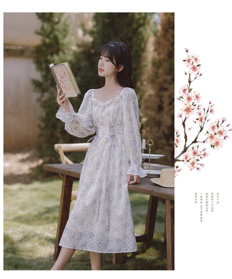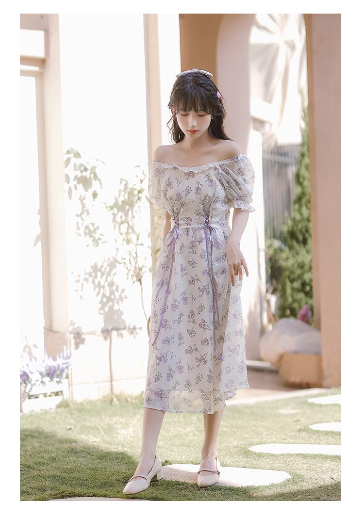送料無料୨♥୧ スプリングサマーレディースミディドレス フローラルレースバンドドレス ワンピース 大人ガーリー スウィート キュート カジュアル 春物 夏物 花柄 レースアップ パープル AOS38016249078