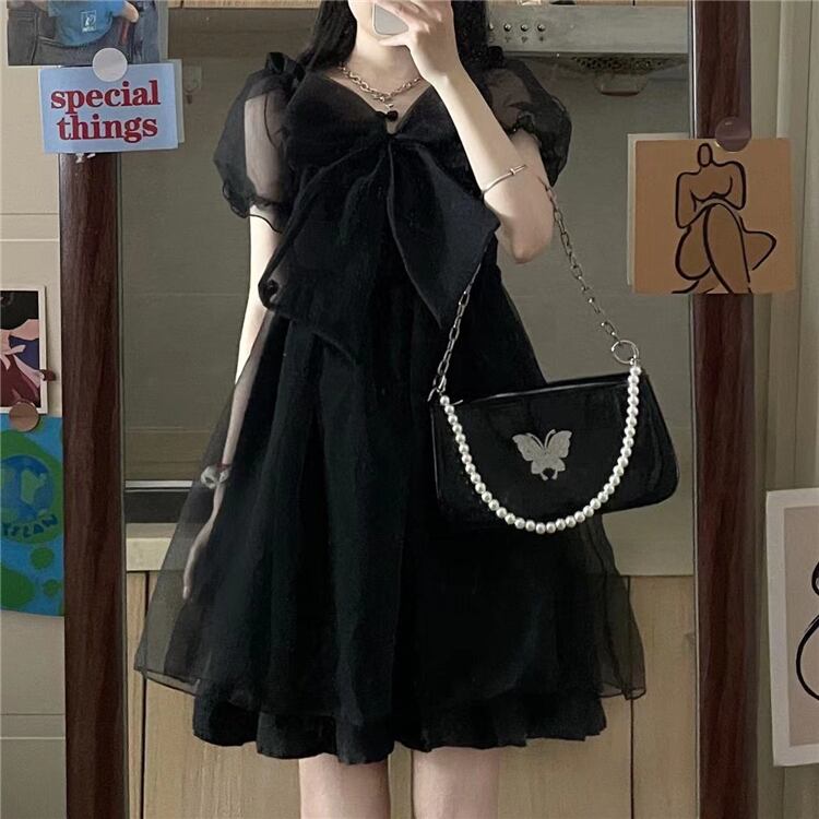 送料無料୨♥୧ サマーレディースブラックミニドレス リボンウェストメッシュ 大人ガーリー スウィート キュート カジュアル かわいい 夏物 AOS34618455419
