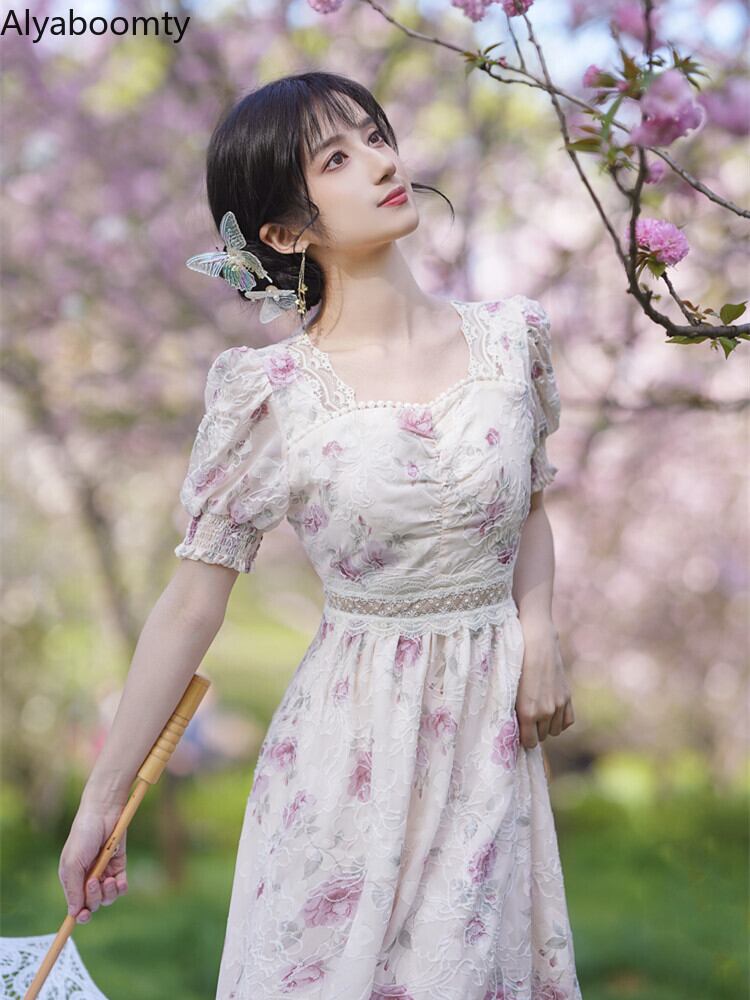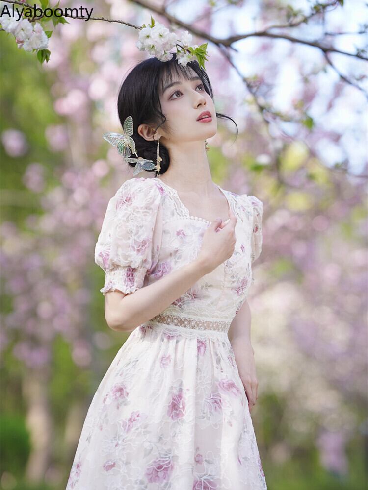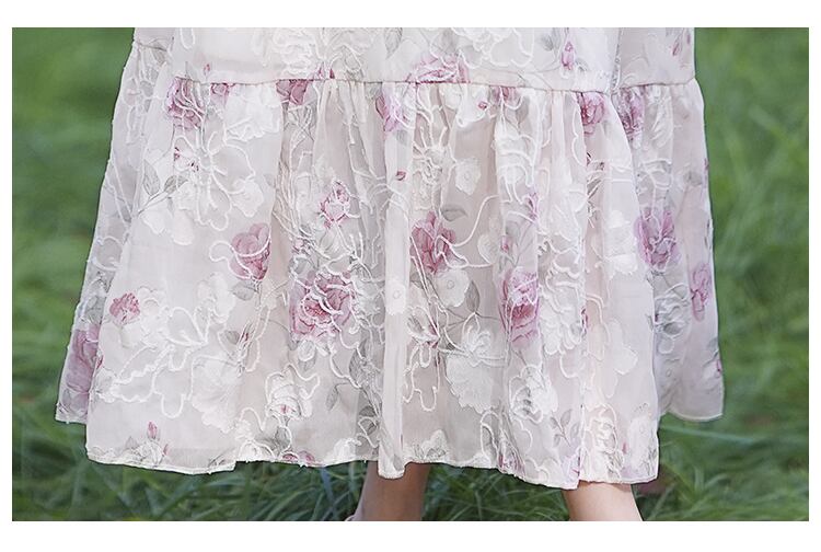 送料無料୨♥୧ サマーレディースAラインドレス フローラルスリーブ刺繍フリルロング ラッフル 大人ガーリー スウィート キュート カジュアル 夏物 花柄 AOS38862696526