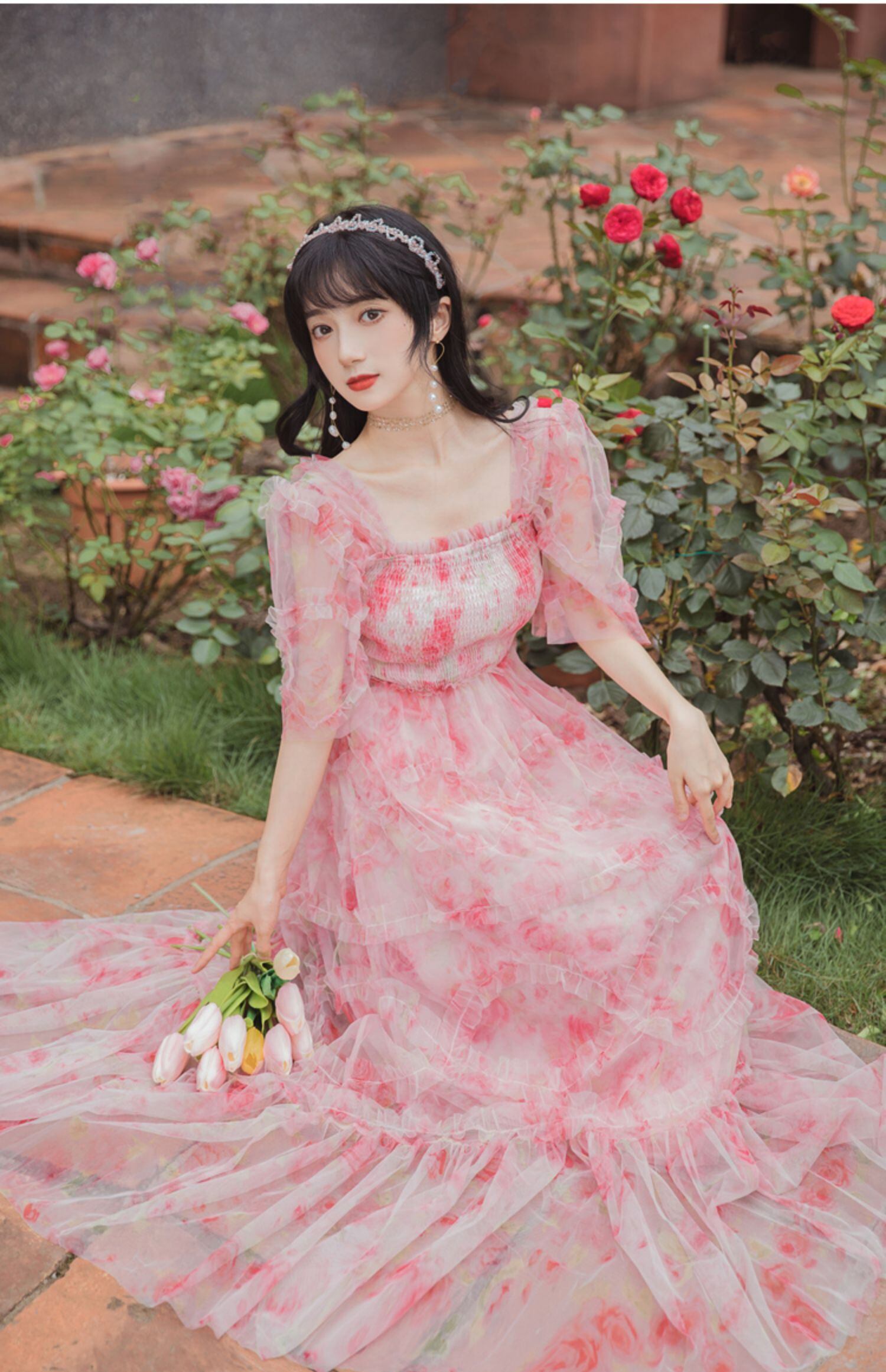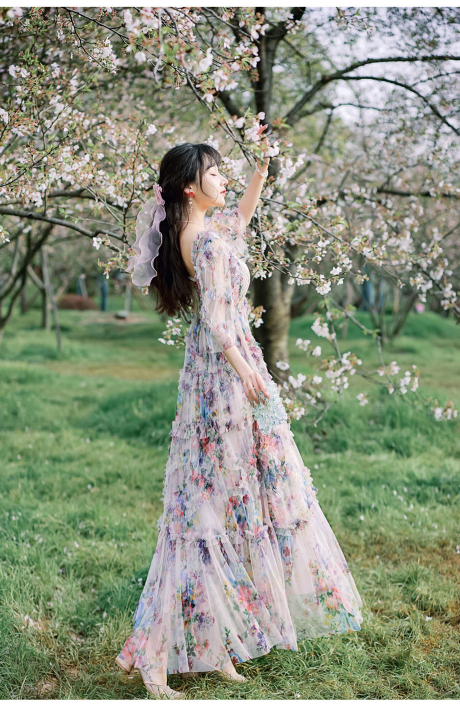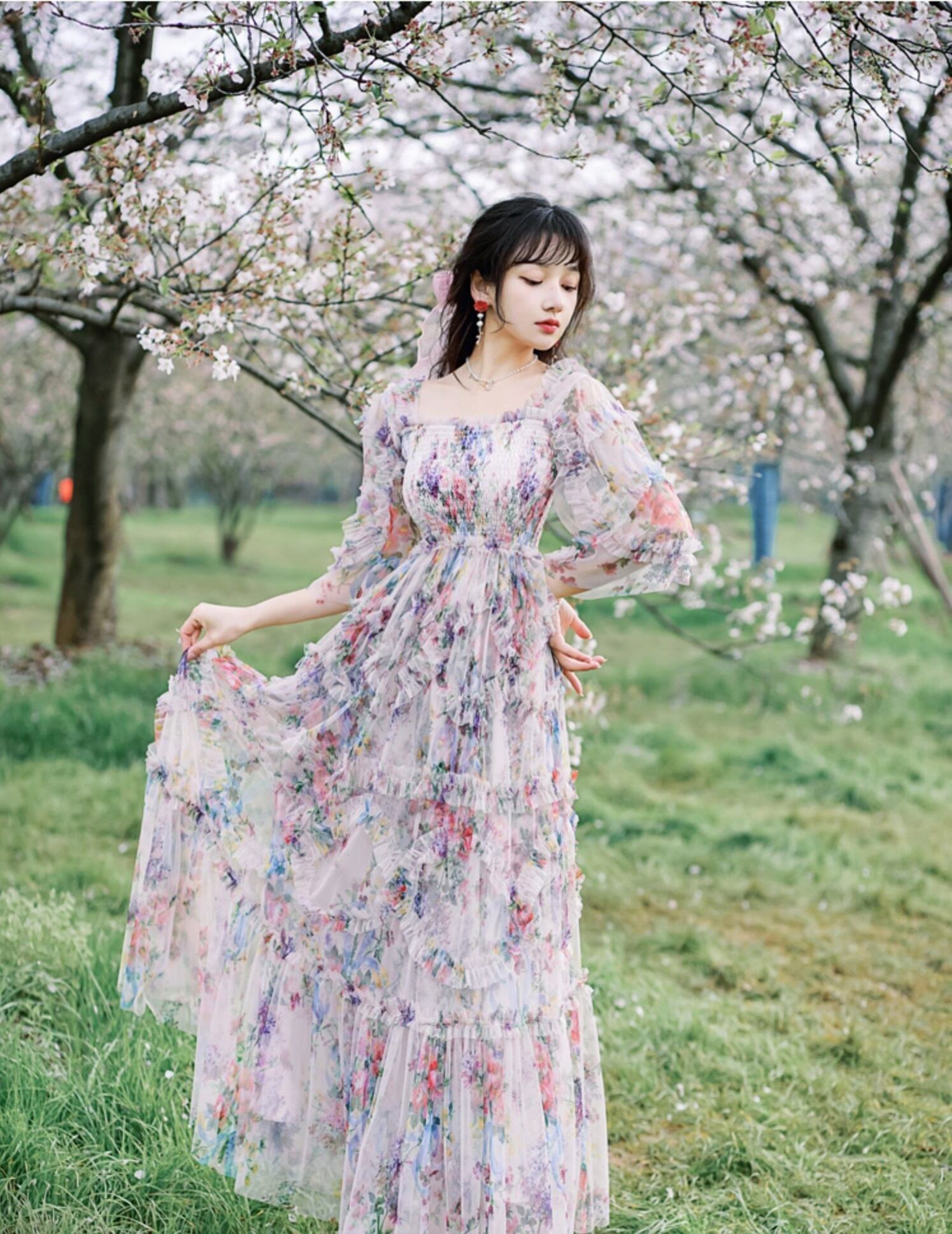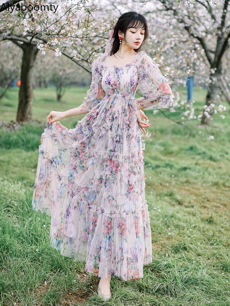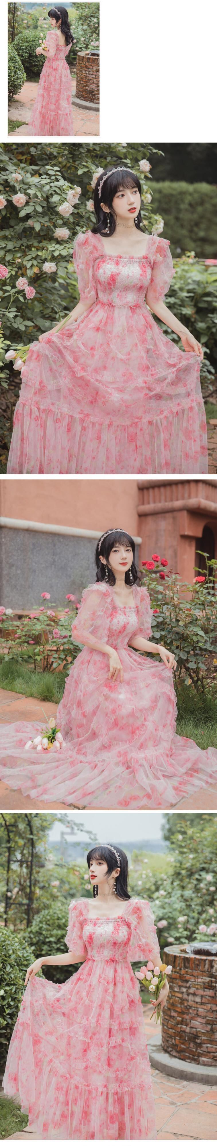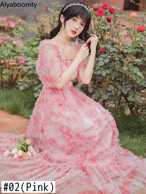 送料無料୨♥୧ サマーレディースマキシドレス フローラルプリントメッシュフリルロングドレス ワンピース レッド ラッフル 大人ガーリー スウィート キュート カジュアル 夏物 花柄 AOS81242259164