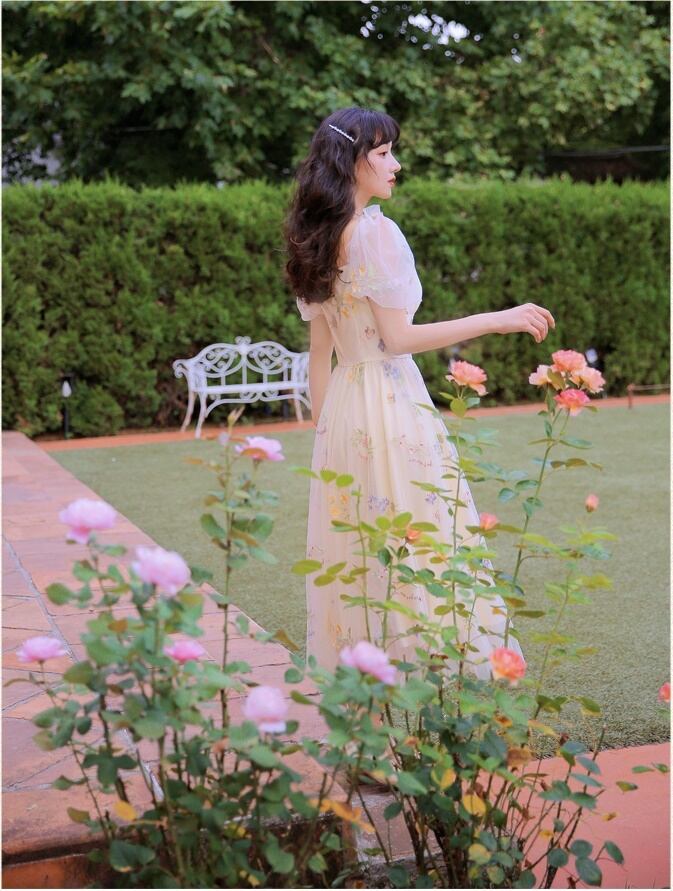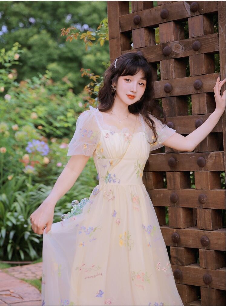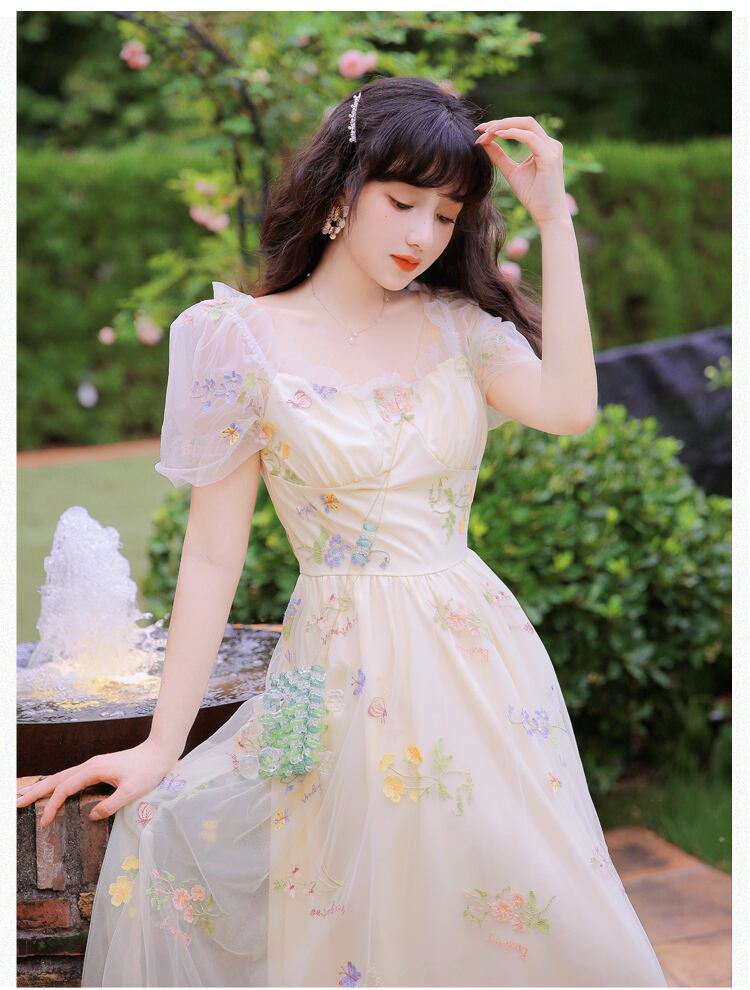 送料無料୨♥୧ サマーレディースロングドレス カラーフローラル刺繍スリーブメッシュ 大人ガーリー スウィート キュート カジュアル 夏物 花柄 スクウェア AOS2216891432