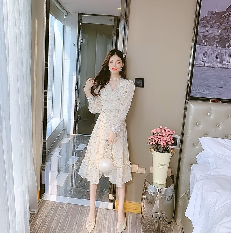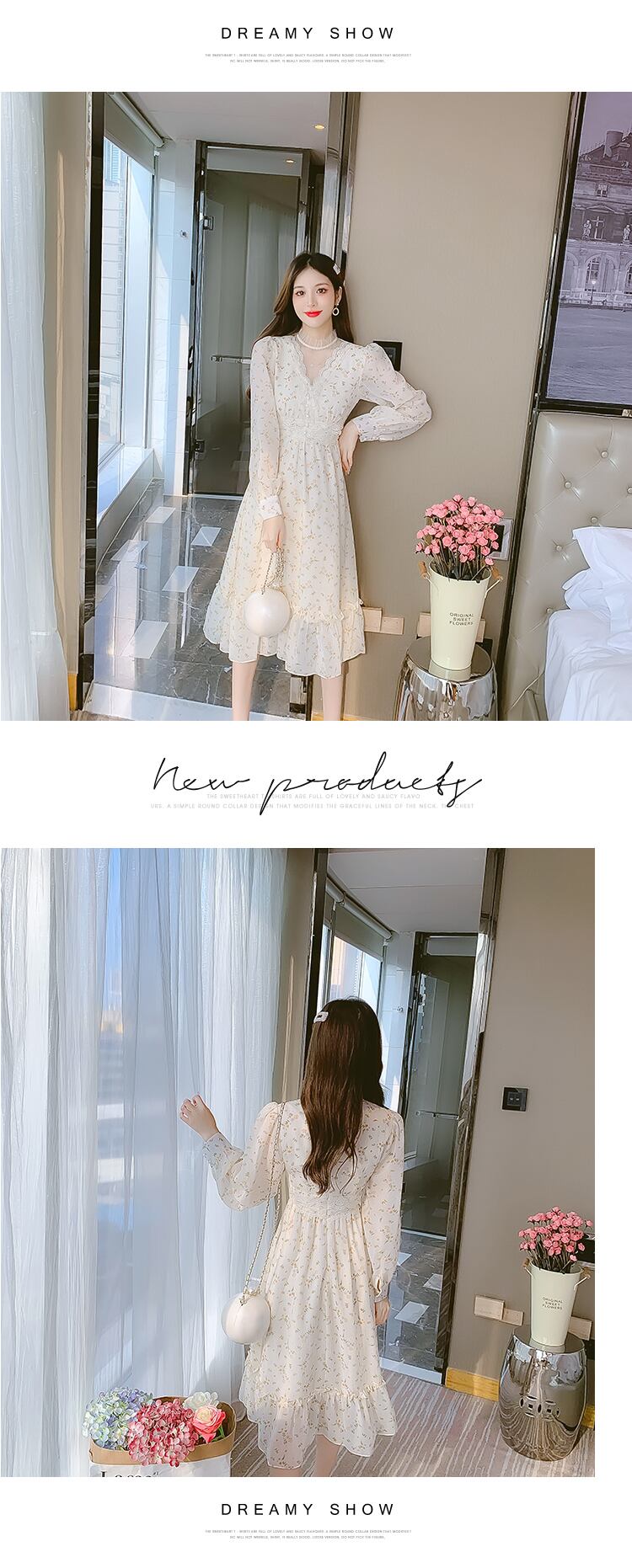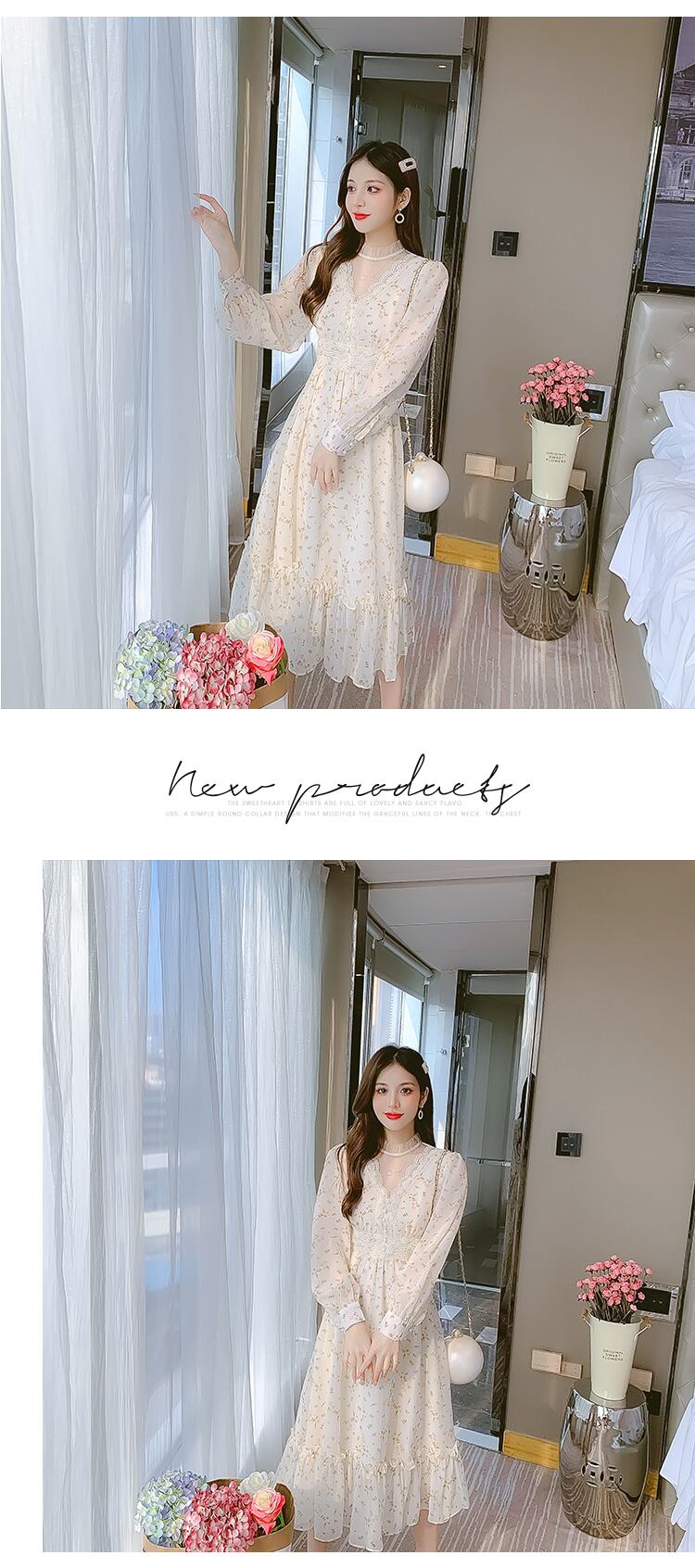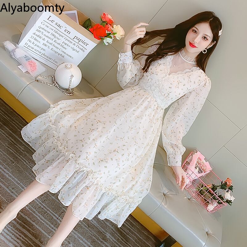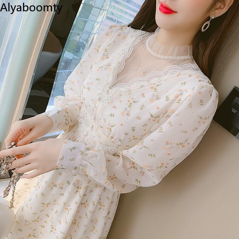 送料無料୨♥୧ スプリングオータムレディースドレス スタンドカラーカラーメッシュレースパッチワークフローラルプリント柄フリル ラッフル 大人ガーリー スウィート キュート カジュアル 春物 秋物 花柄 AOS34144970226