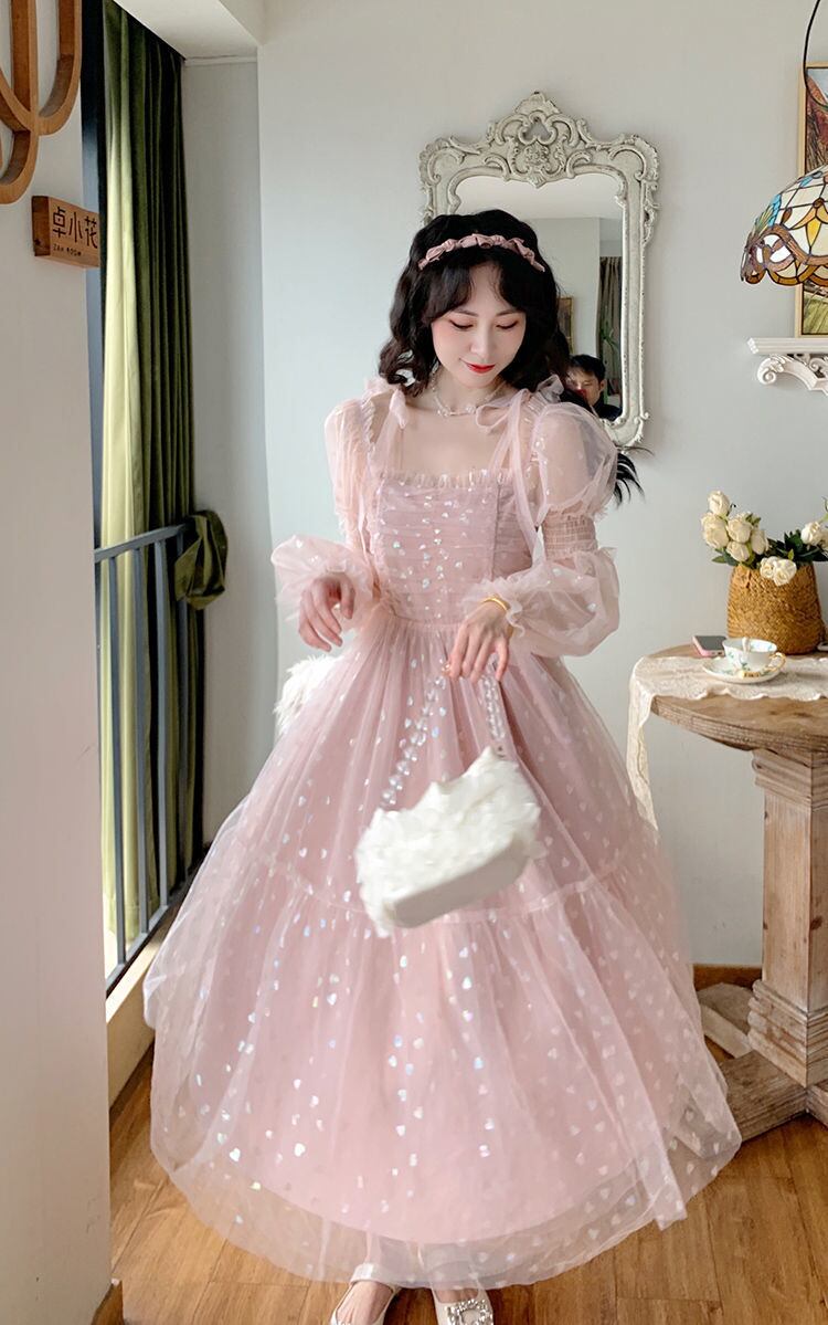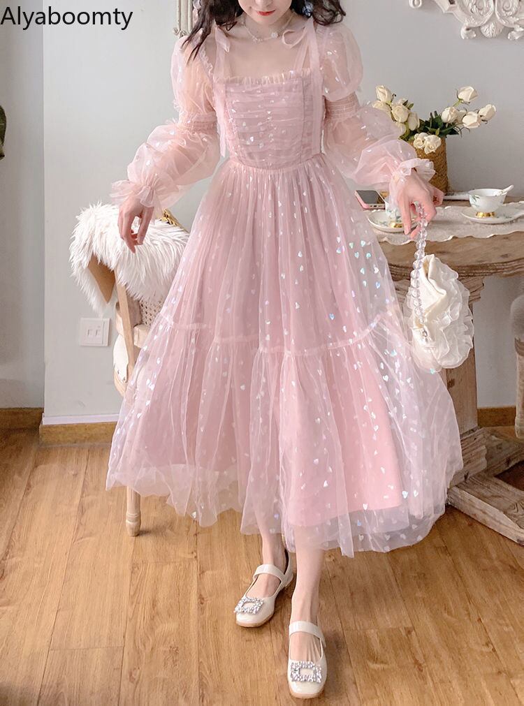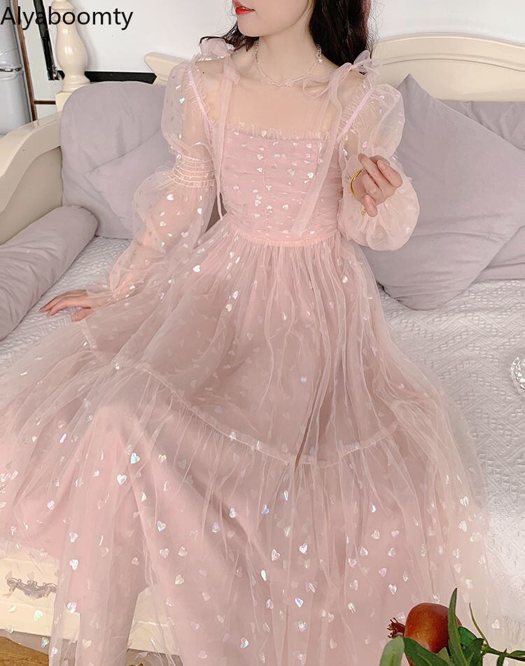 送料無料୨♥୧ スプリングオータムレディースロングドレス ハートメッシュスリーブミディ ピンク ランタンスリーブ 春物 秋物 AOS97724762089