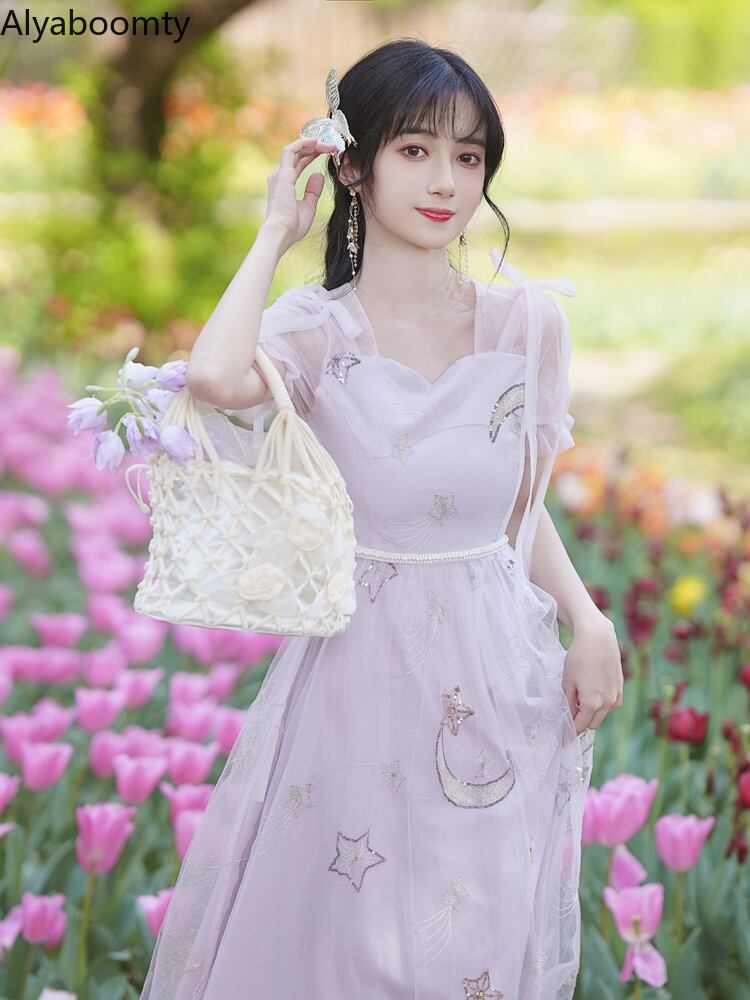 送料無料୨♥୧ サマーレディースロングドレス カラーメッシュスリーブ刺繍リボン 夏物 パープル スクウェア AOS54890919703