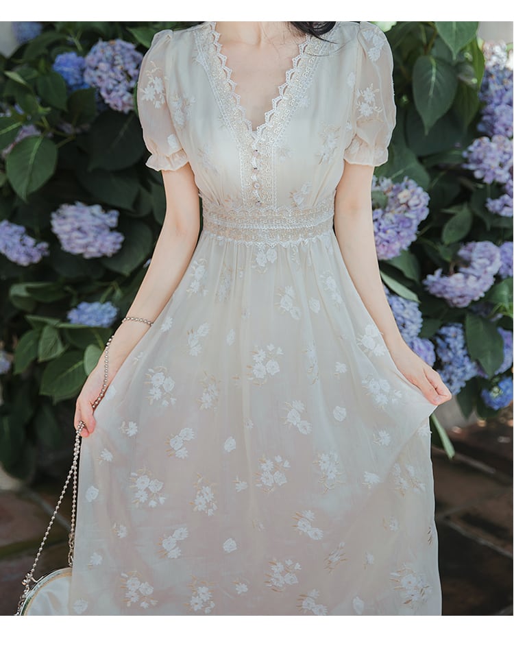 送料無料୨♥୧ サマーレディースロングAラインドレス Vネックフローラルスリーブ刺繍ミディ 大人ガーリー スウィート キュート カジュアル 夏物 花柄 AOS63808918915