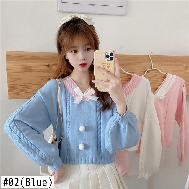 送料無料୨♥୧ カラースタイルレディースプルオーバー セーター Vネックホワイトブルーリボンショートクロップトップ トップス ピンク 大人ガーリー スウィート キュート カジュアル AOS96262905309