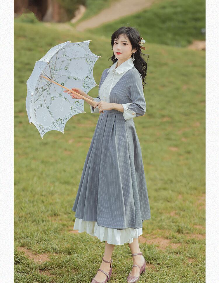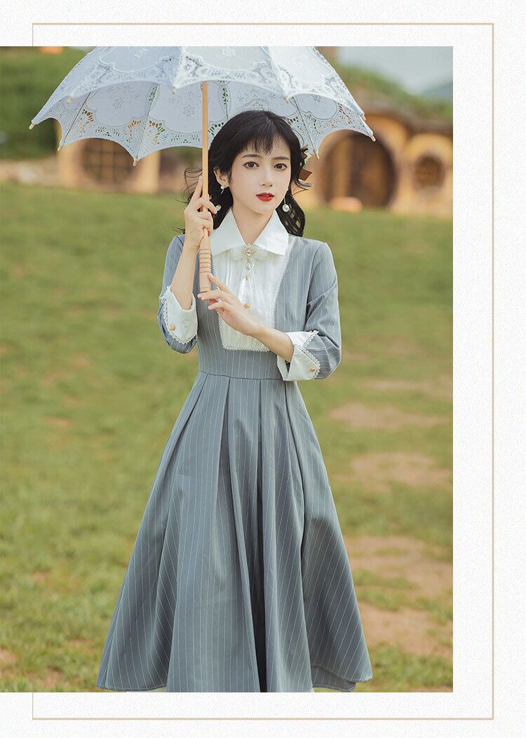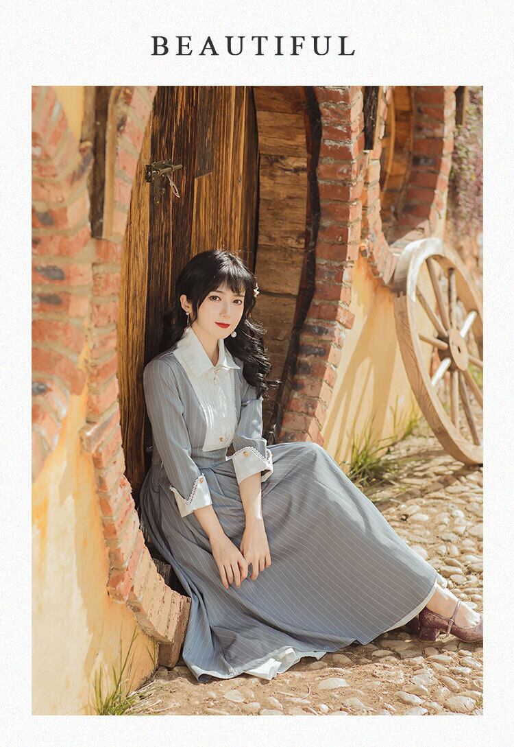 送料無料୨♥୧ スタイルスプリングレディースミディドレス パッチワークストライプ七部袖スリーブヴィンテージフリルプリーツ ラッフル 春物 ビンテージ ヨーロピアン AOS75167976028