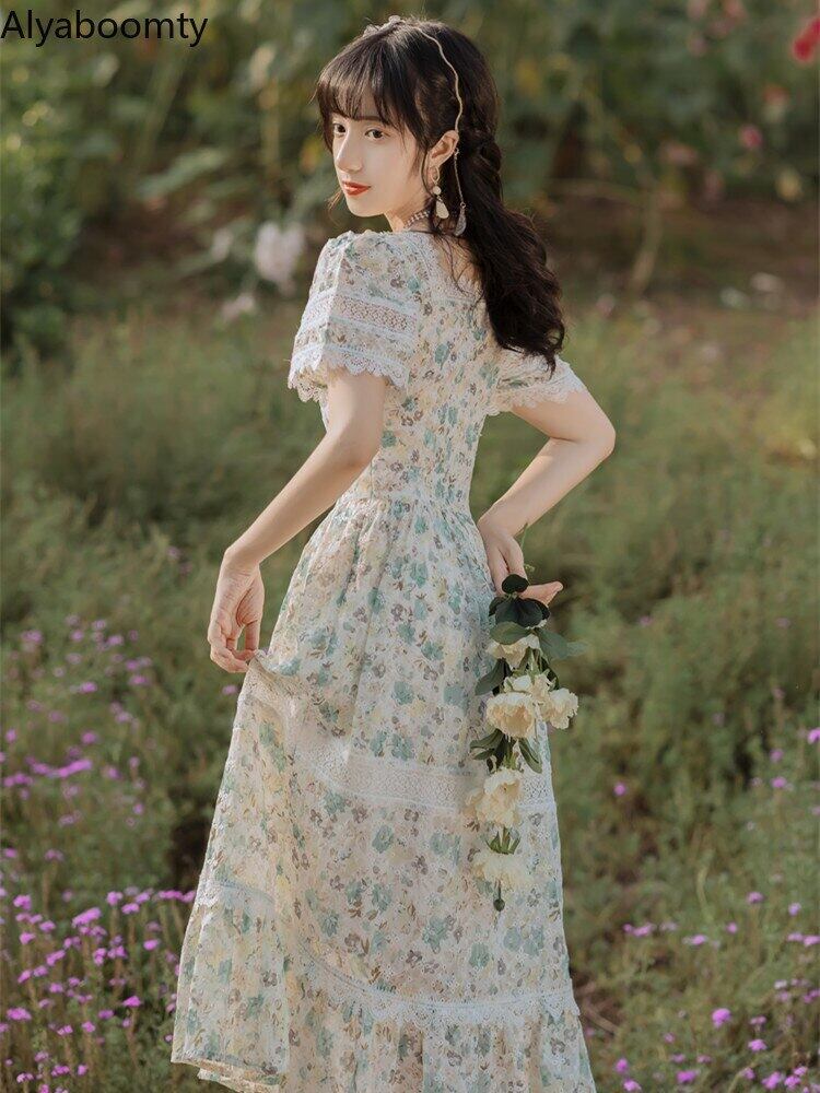 送料無料୨♥୧ サマーレディースロングAラインドレス カラーフローラルプリントレースフリル ラッフル 大人ガーリー スウィート キュート カジュアル 夏物 花柄 スクウェア AOS9561358787