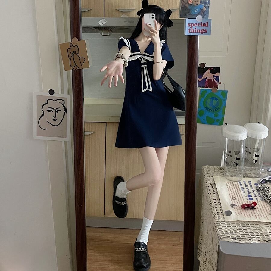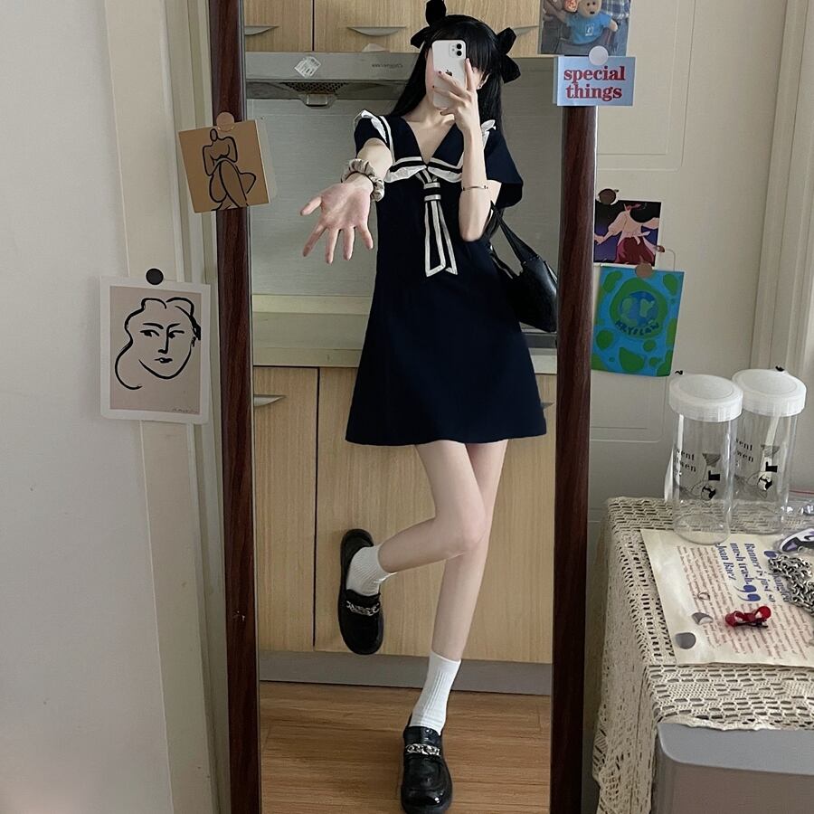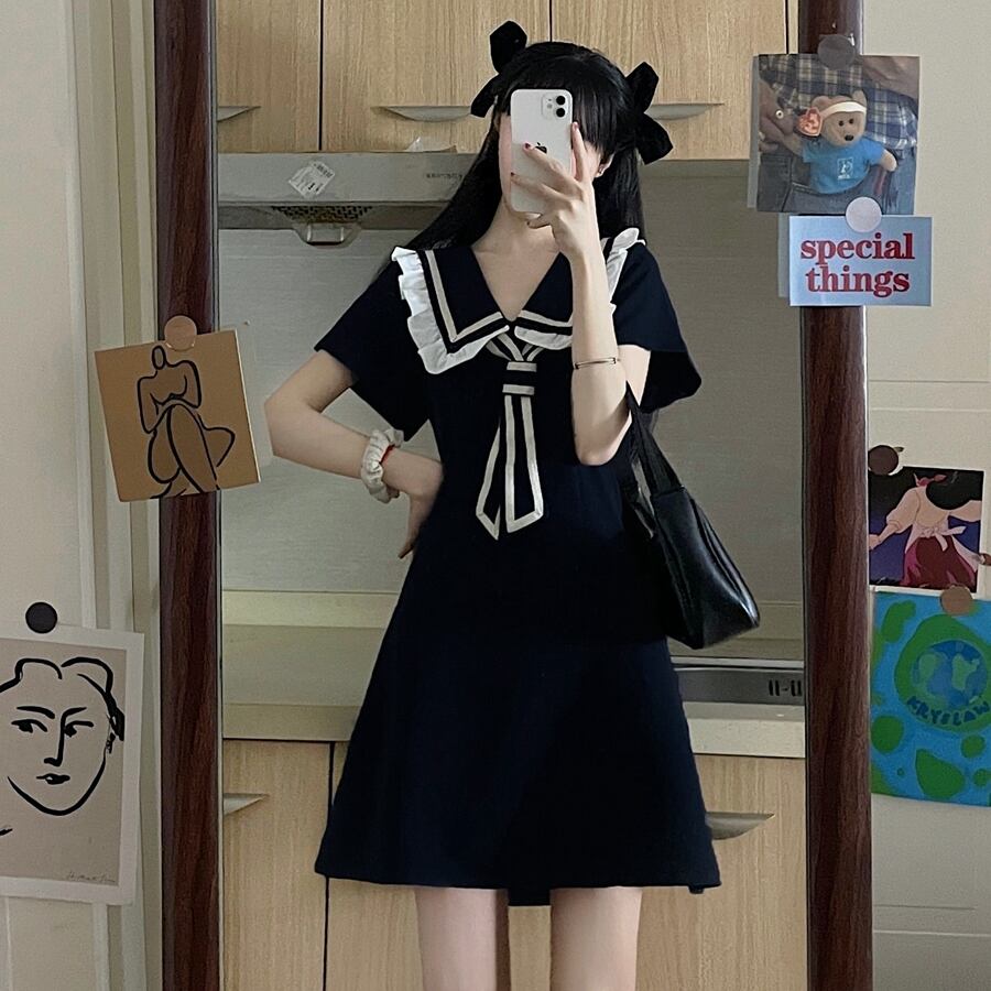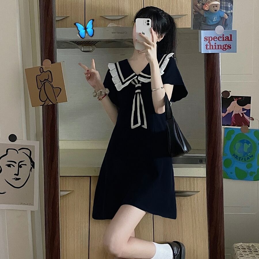 送料無料୨♥୧ サマーレディーススタイルミニドレス カラーブラックネイビー半袖スリーブ ショート ハーフスリーブ 大人ガーリー スウィート キュート カジュアル 夏物 AOS12538585444