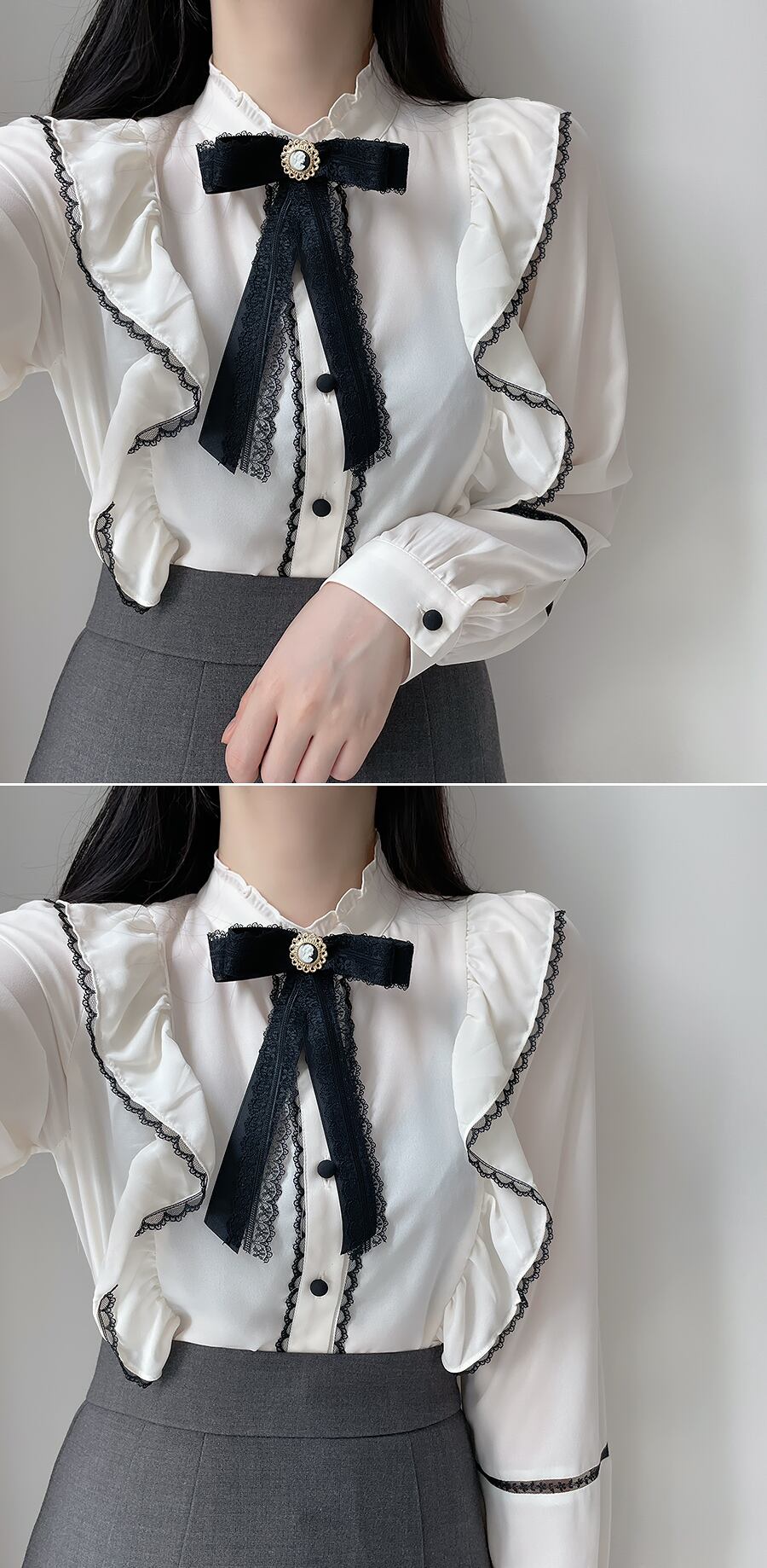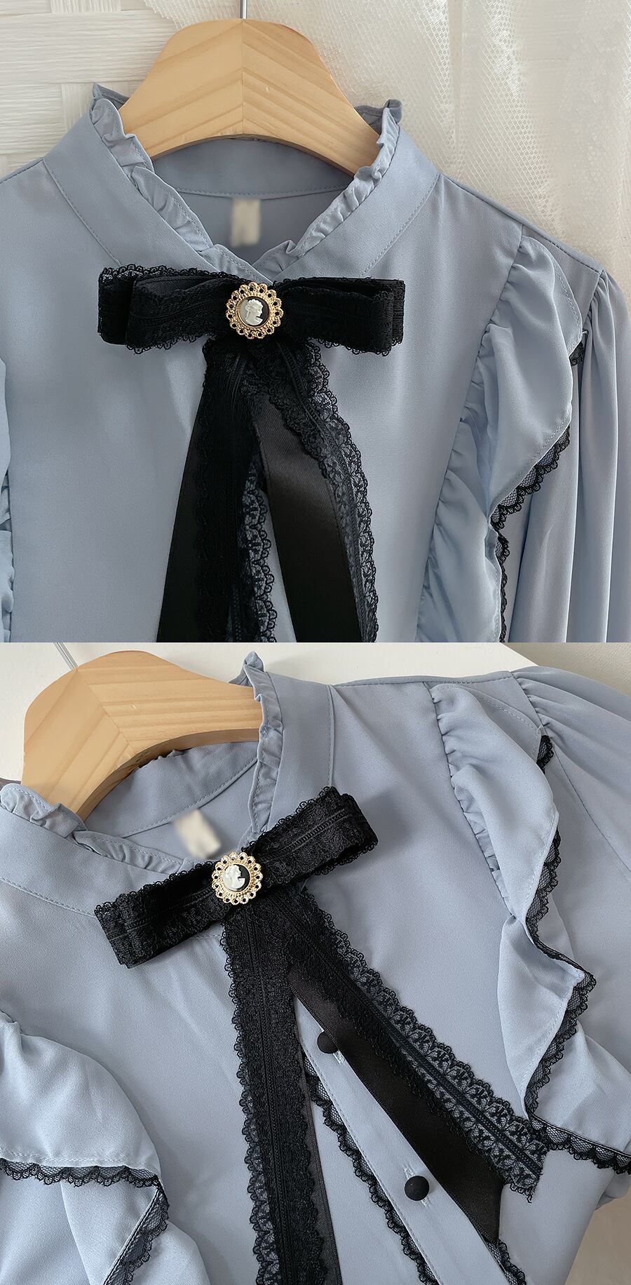 送料無料୨♥୧ スプリングオータムスタイルスタンドカラーカラーホワイトブルーリボンフリルブラウス 長袖スリーブソリッド シャツ ロング ラッフル 大人ガーリー スウィート キュート カジュアル 春物 秋物 ソリッドカラー ヨーロピアン AOS96400509692