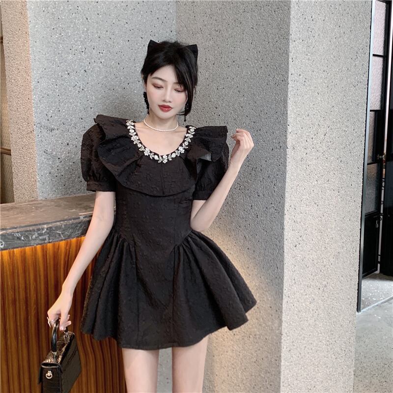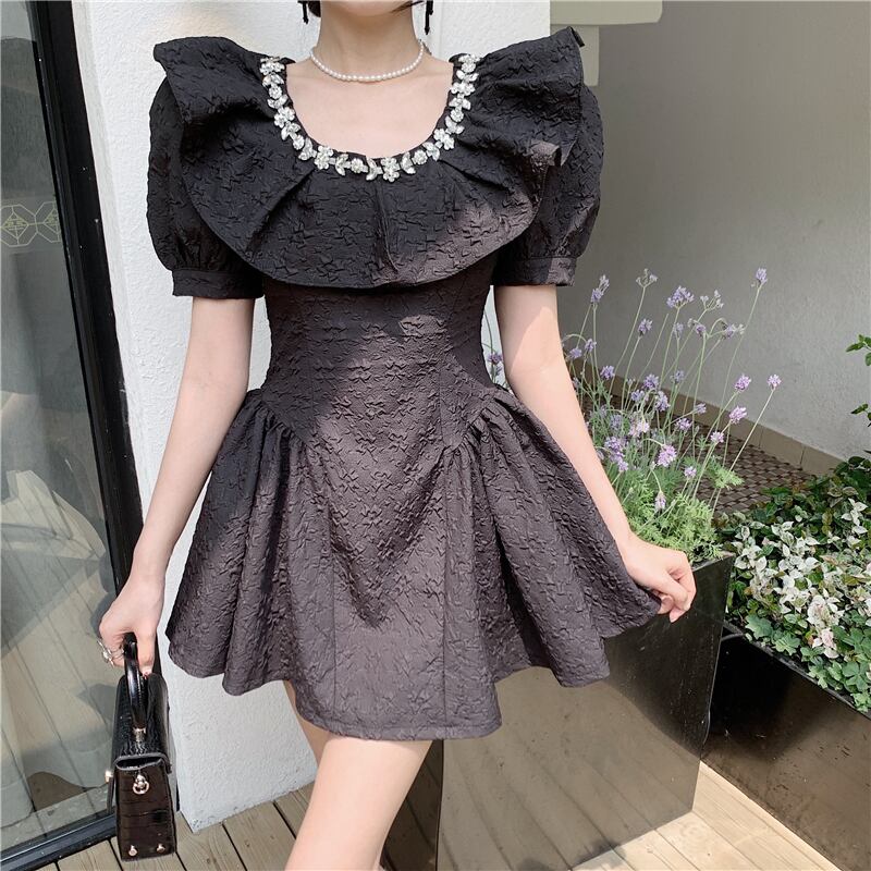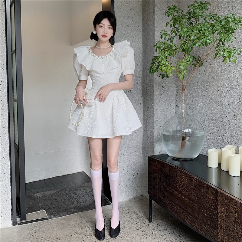 送料無料୨♥୧ サマーレディースミニドレス カラーウェストブラックホワイトスリーブジャカード 夏物 AOS52647266065