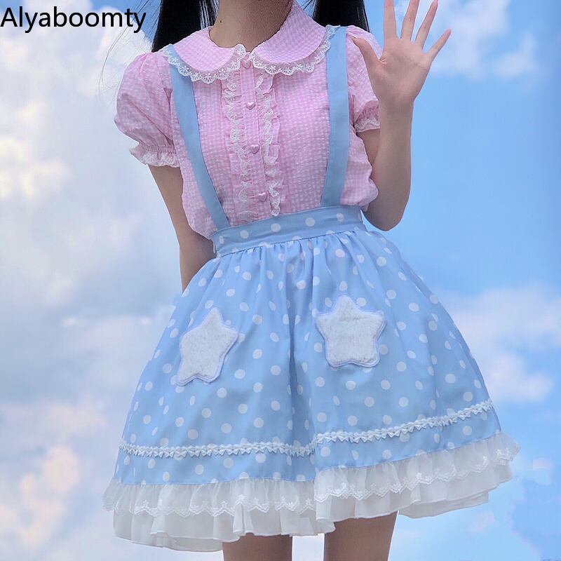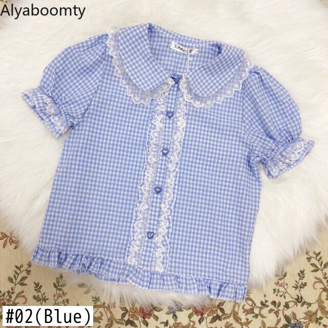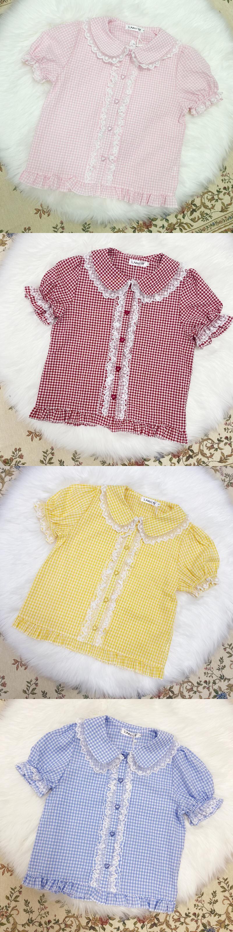 送料無料୨♥୧ カラーサマーレディースブラウス 格子柄レースフリルシャツ ブルーイエローハート ピンク ラッフル 夏物 AOS42128185225