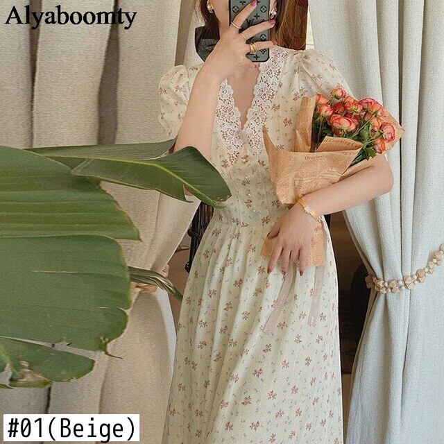送料無料୨♥୧ サマーレディースロングドレス レースVネックベージュブルーフローラルプリントスリーブミディドレス ワンピース 夏物 花柄 AOS46483813962