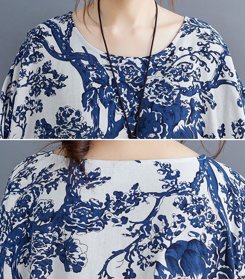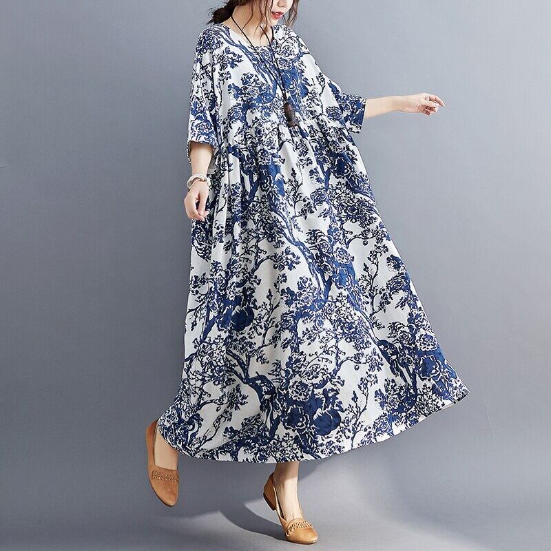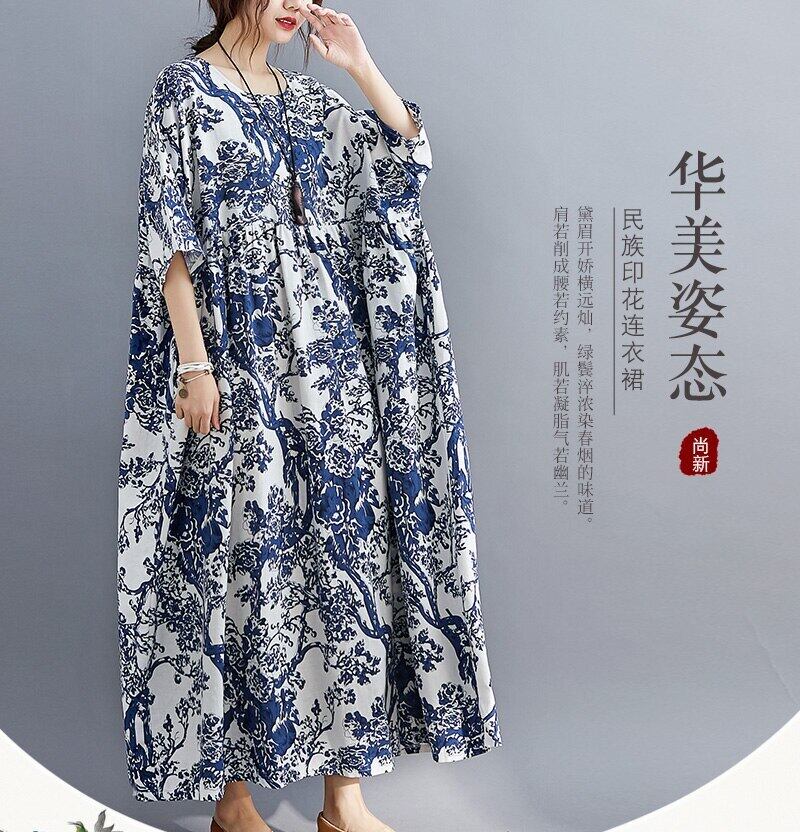 送料無料୨♥୧ サマーレディースマキシロングドレス ヴィンテージプリントルーズガウンバギー コットン 夏物 Oネック ビンテージ AOS55498721102