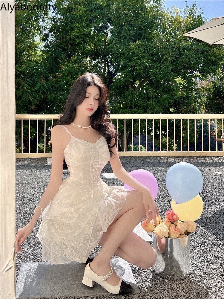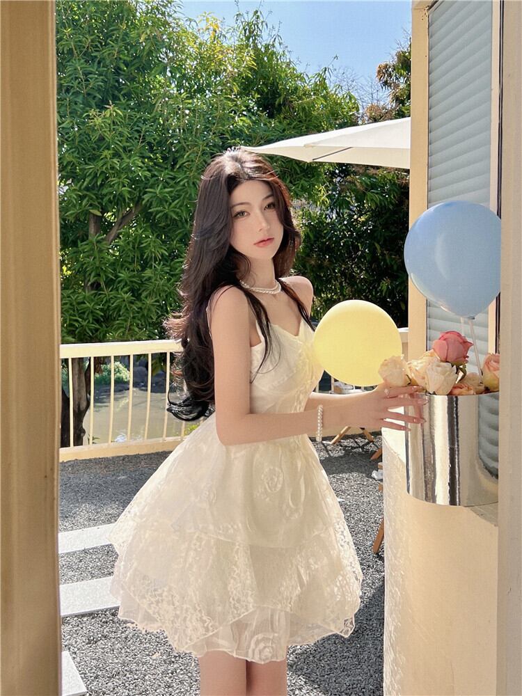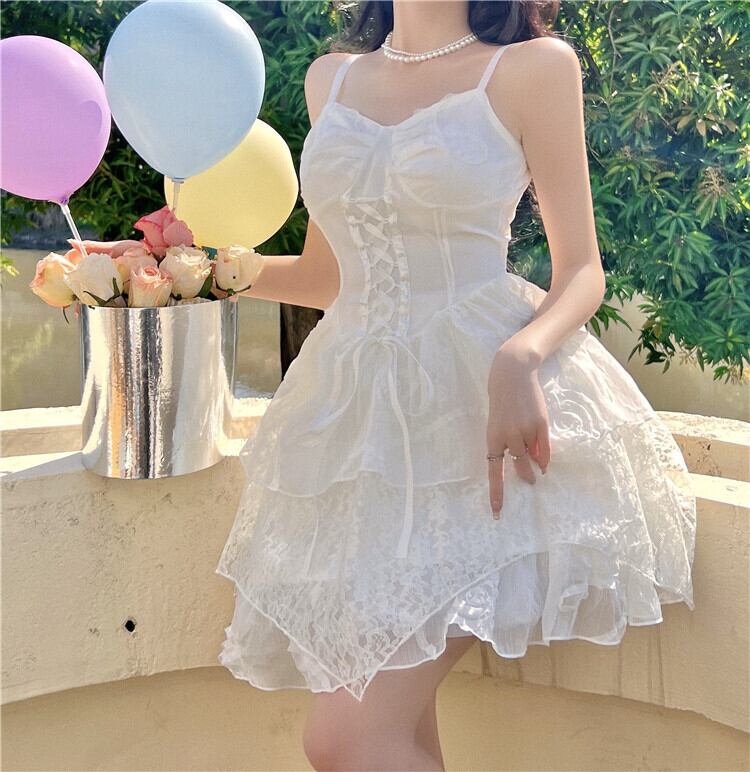 送料無料୨♥୧ サマーレディースホワイトドレス バンドフローラルレースフリルミニ レッド ラッフル 大人ガーリー スウィート キュート カジュアル 夏物 花柄 AOS72080051159