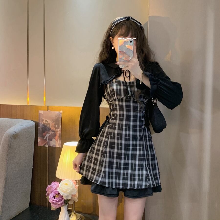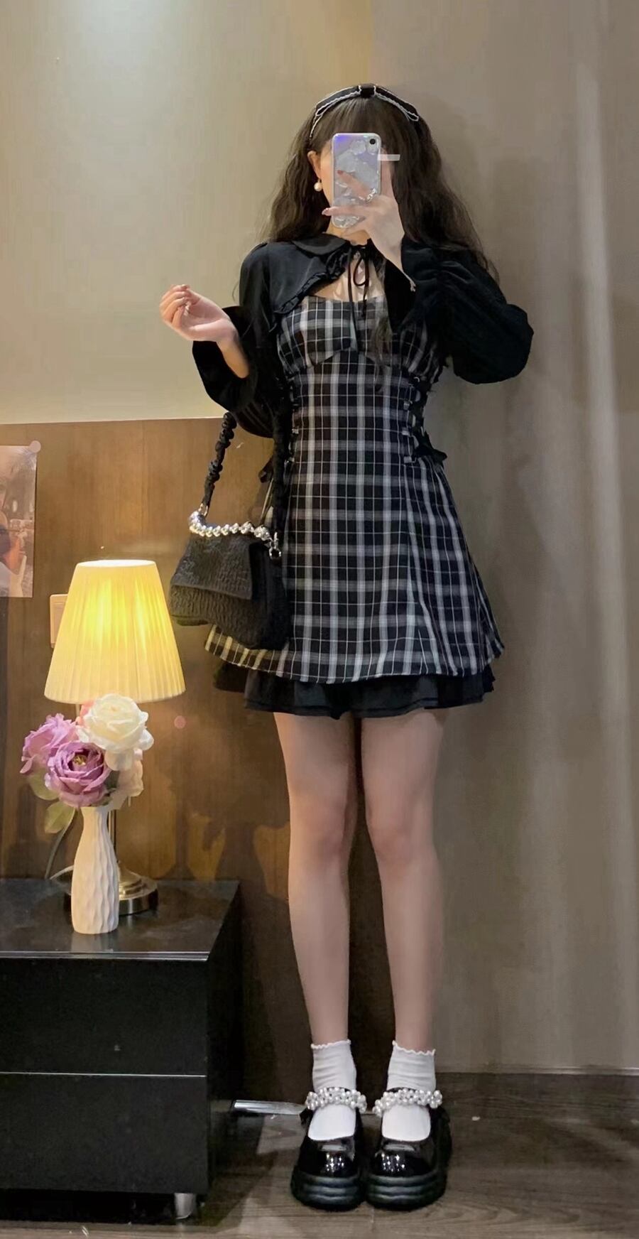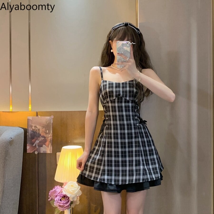 送料無料୨♥୧ サマーレディースミニドレス ブラック格子柄バンドヴィンテージパッチワークスリム かわいい 夏物 ビンテージ AOS10646727158