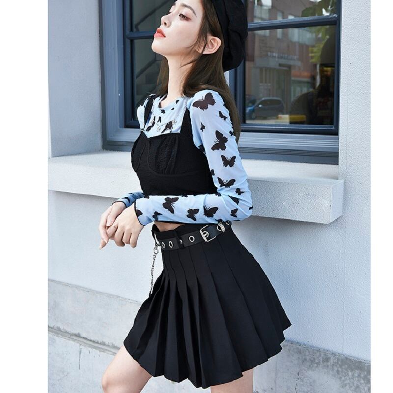 送料無料୨♥୧ レディースセット パッチワークButterflyデザイン ミニプリーツスカート ブラック 大人ガーリー スウィート キュート カジュアル かわいい AOS73892907421