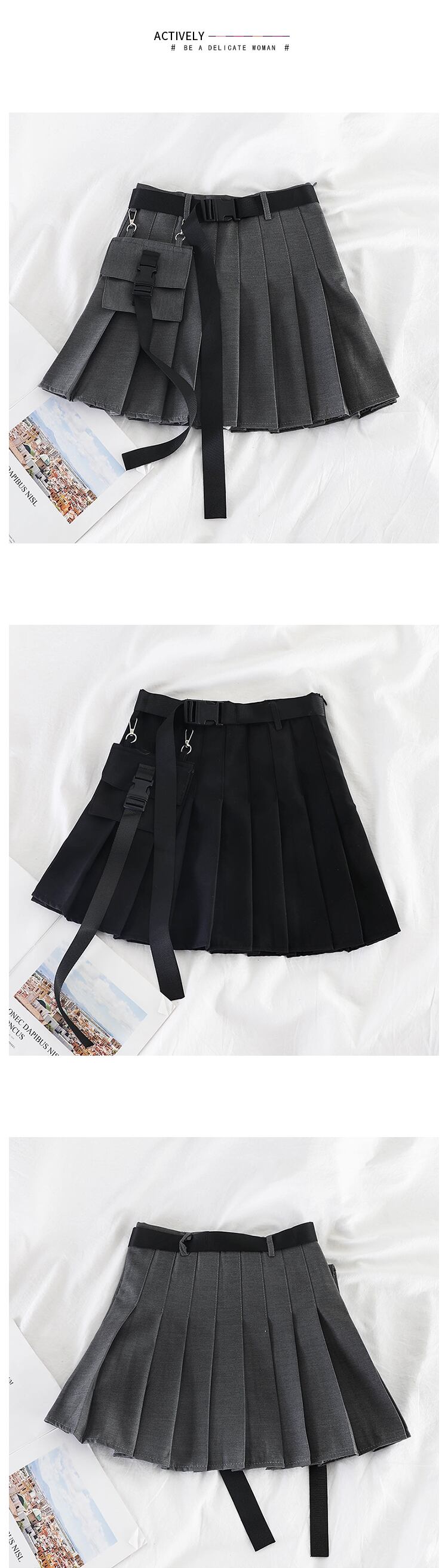 送料無料୨♥୧ レディースストリートウェアスカート スタイルウェストブラックグレーミニプリーツベルト かわいい ハーネス AOS67308432492