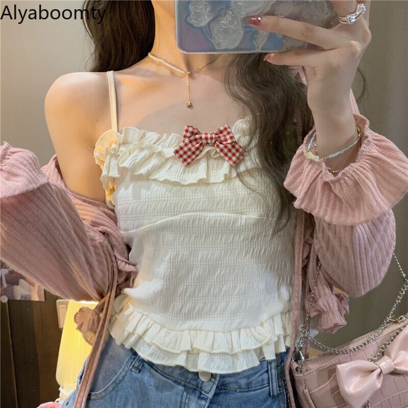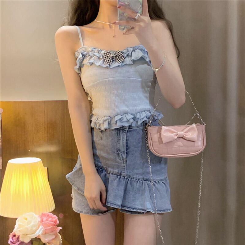送料無料୨♥୧ サマーレディースクロップトップ トップス ブルーベージュリボンフリルキャミスリムショートタンクトップ ラッフル 大人ガーリー スウィート キュート カジュアル 夏物 AOS16398162569
