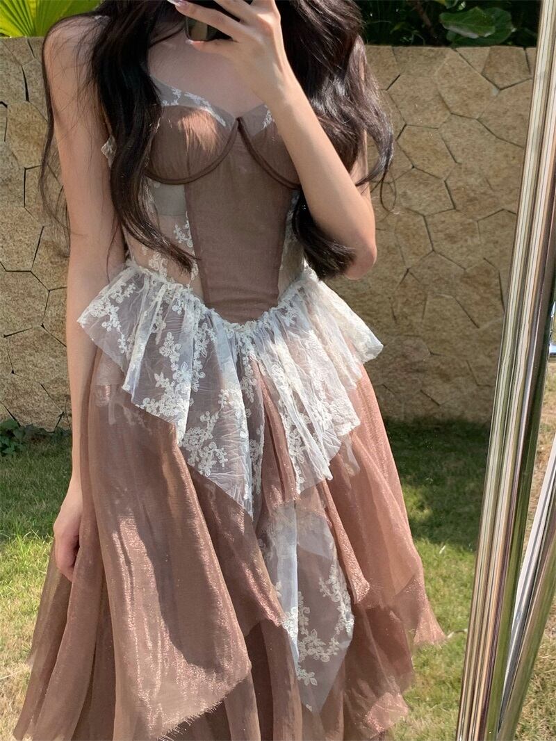 送料無料୨♥୧ サマーレディースロングドレス レースフリルパッチワークバックレスメッシュドレス ワンピース ラッフル 夏物 ビーチ AOS23523403806