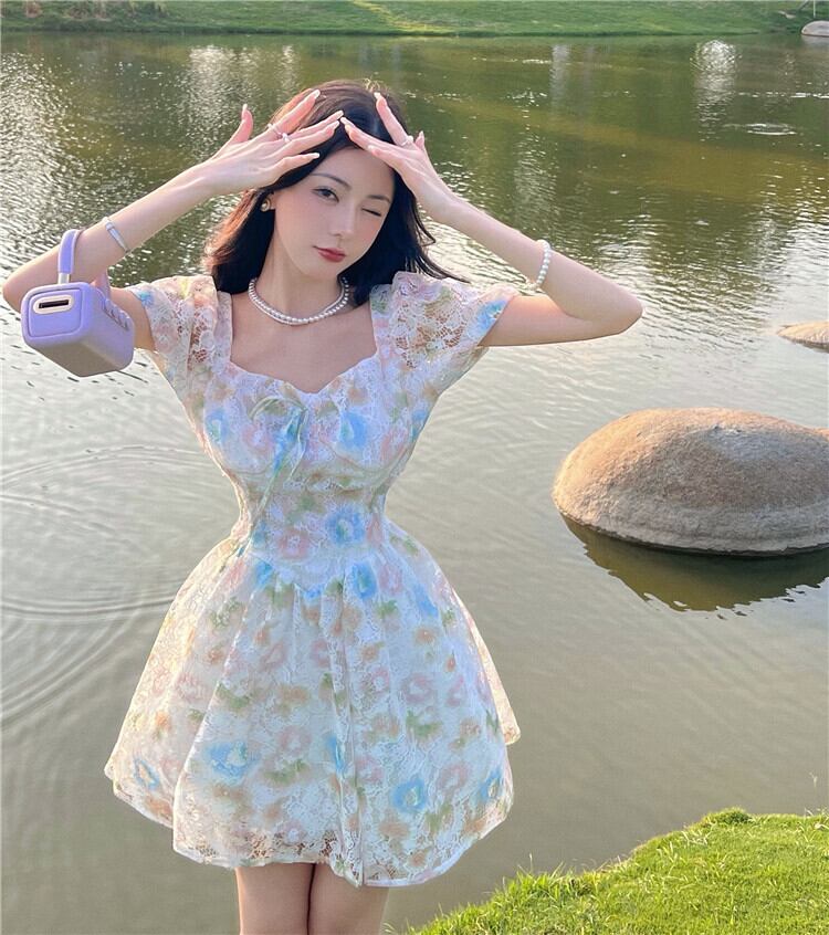 送料無料୨♥୧ レディースドレス カラーバンドフローラルスリーブレースミニ 花柄 スクウェア AOS56604692568