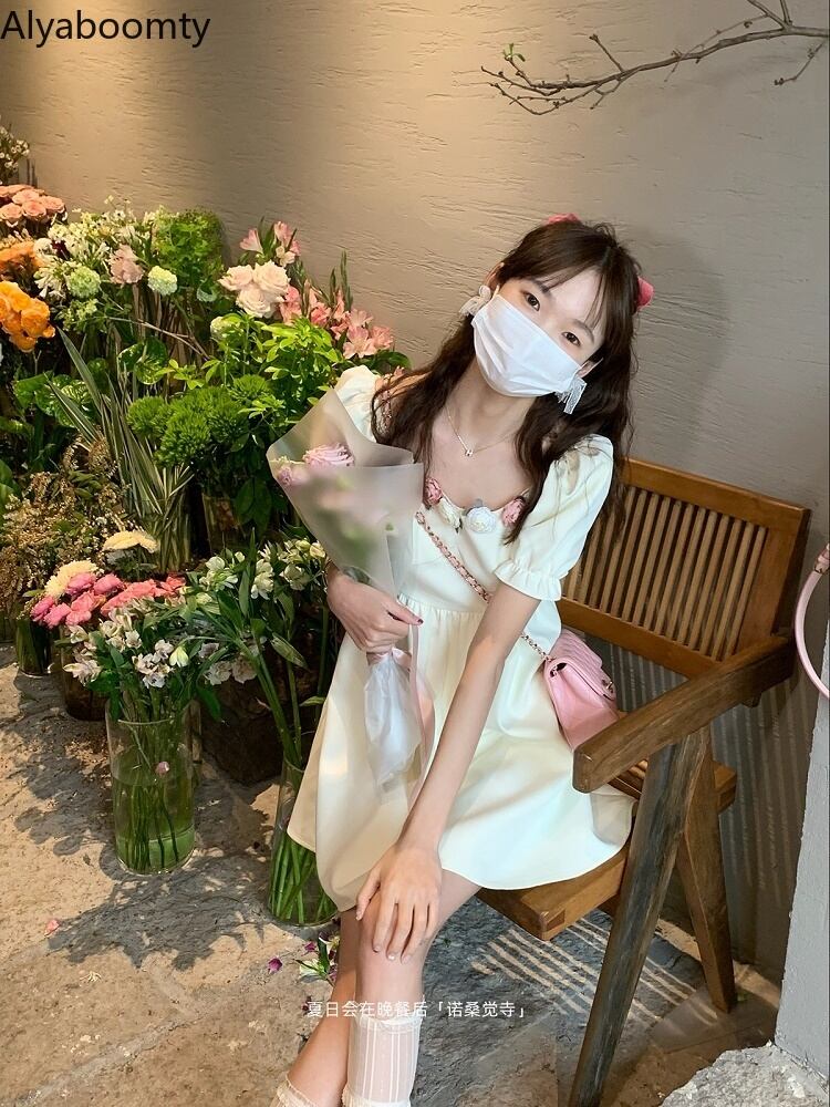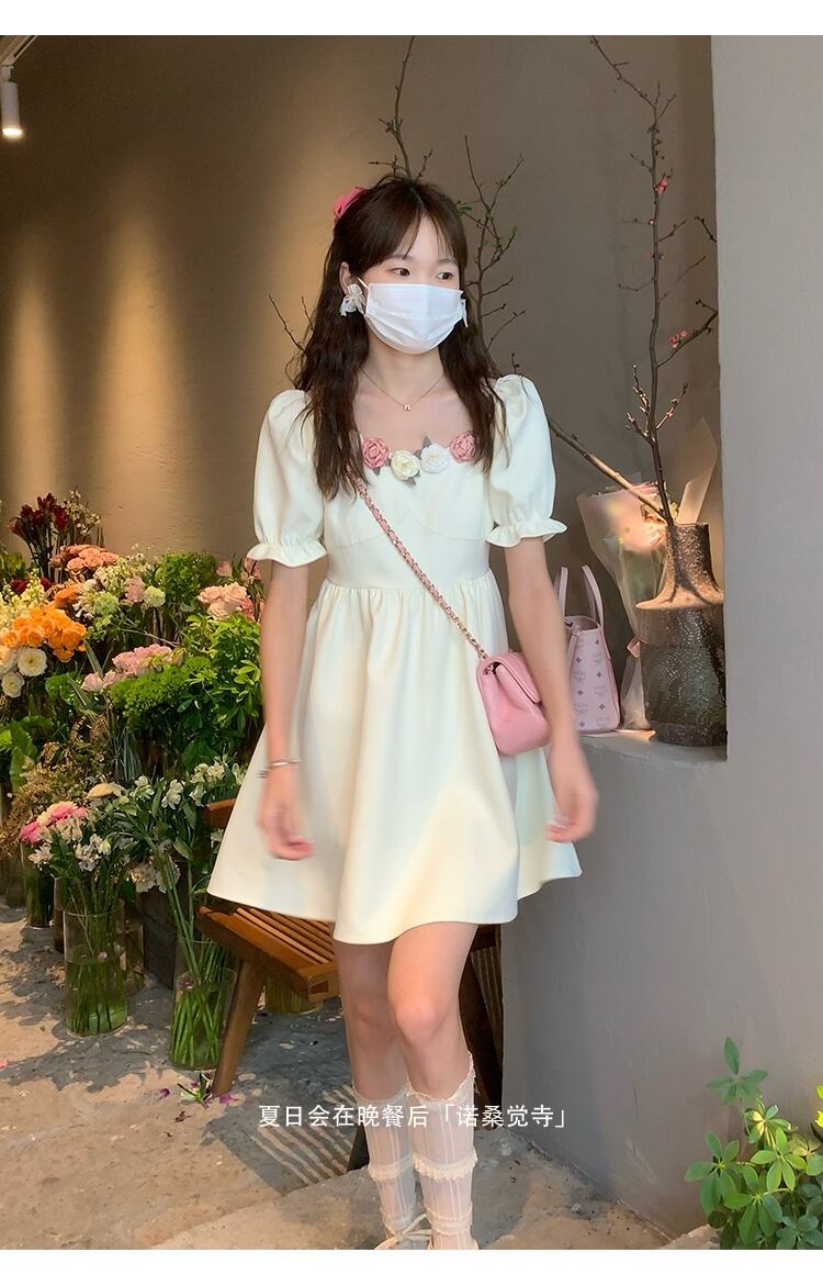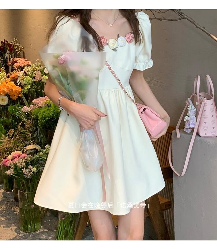 送料無料୨♥୧ サマーレディースAラインミニドレス カラーフローラルスリーブ 大人ガーリー スウィート キュート カジュアル 夏物 花柄 スクウェア AOS43279431707