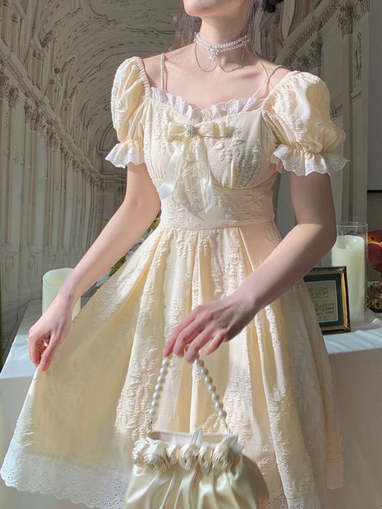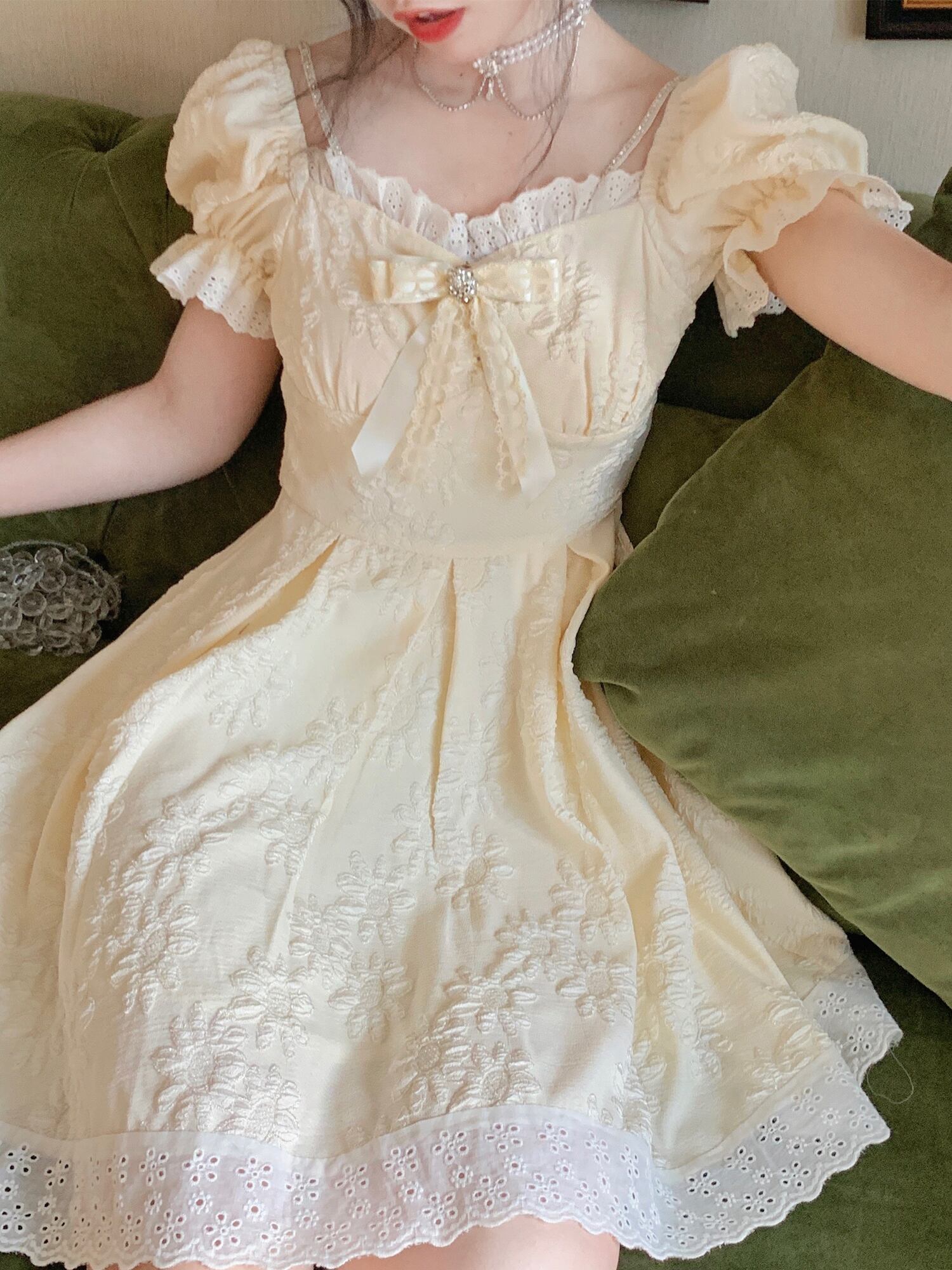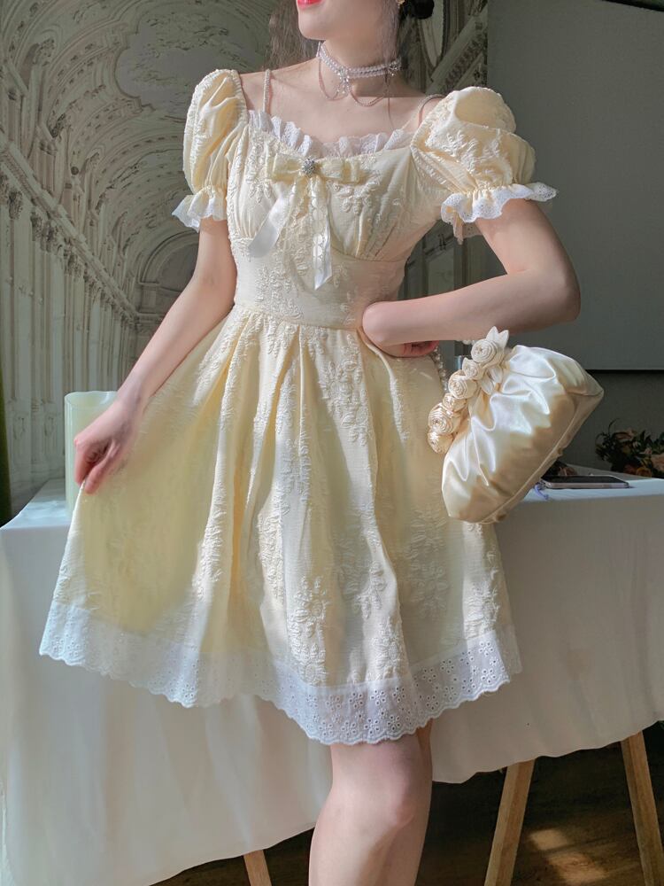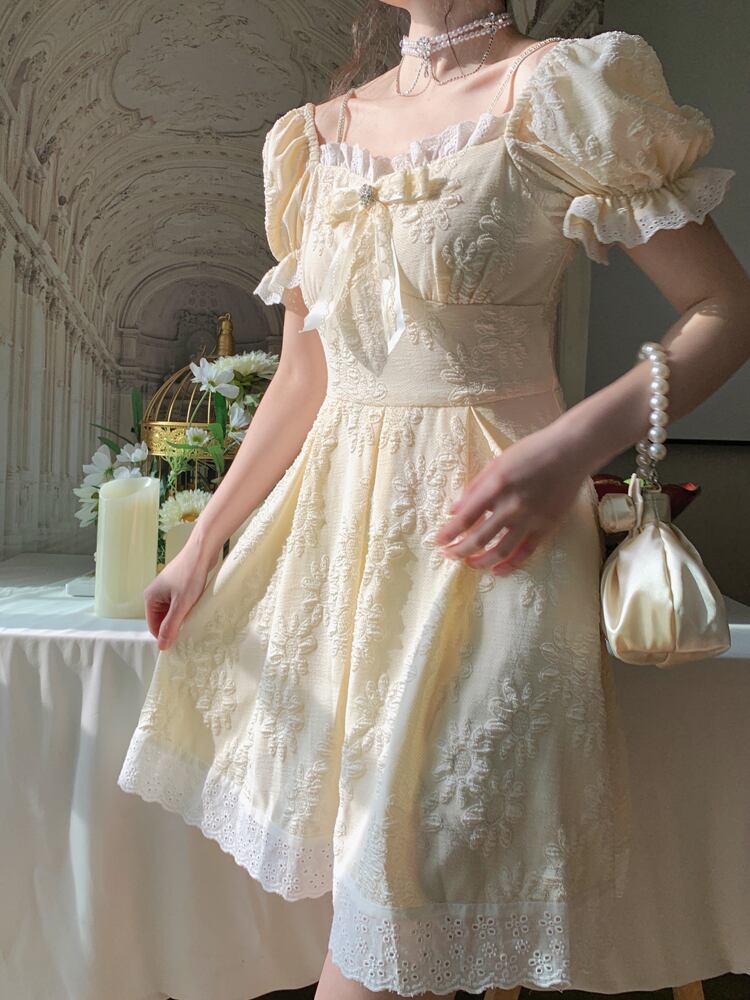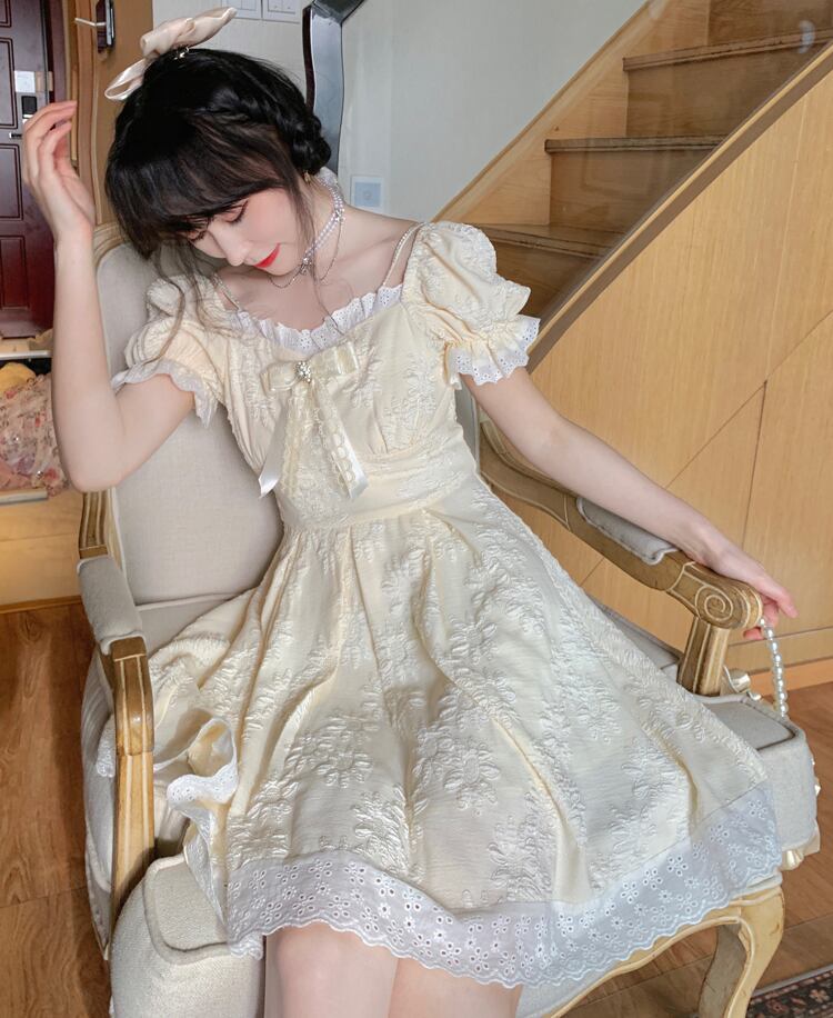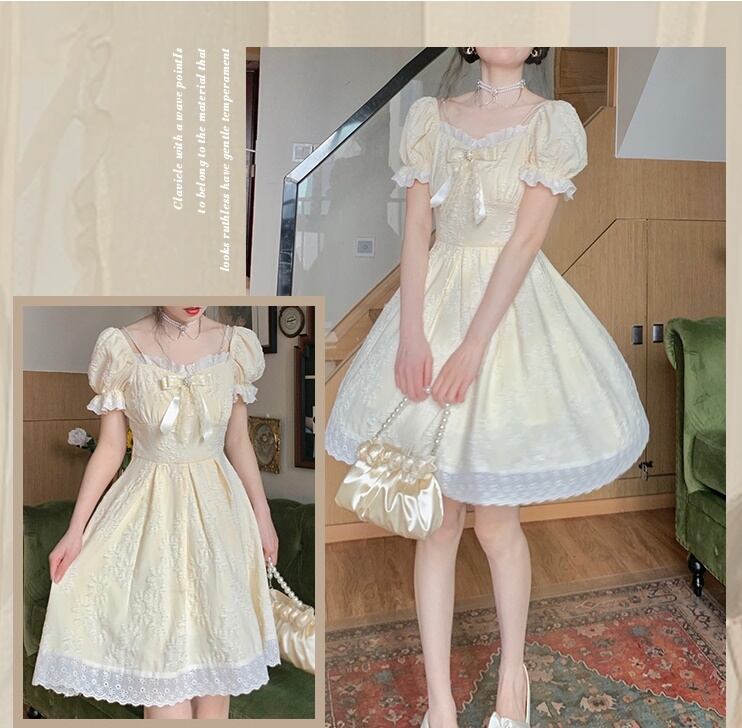 送料無料୨♥୧ サマーレディースドレス カラーリボンジャカードスリーブレースフリル ラッフル 大人ガーリー スウィート キュート カジュアル 夏物 スクウェア AOS27333605548
