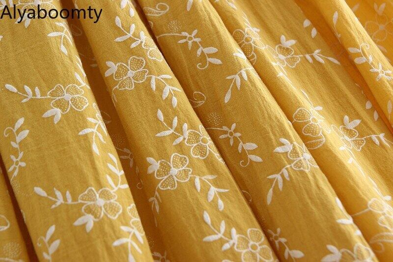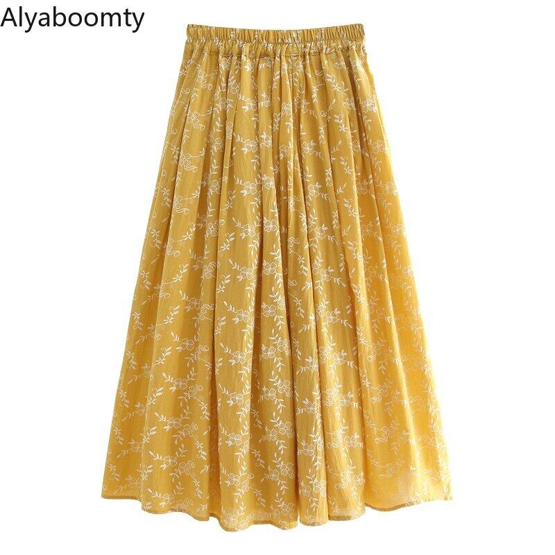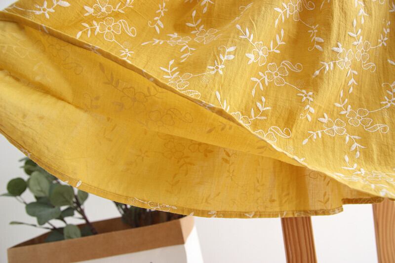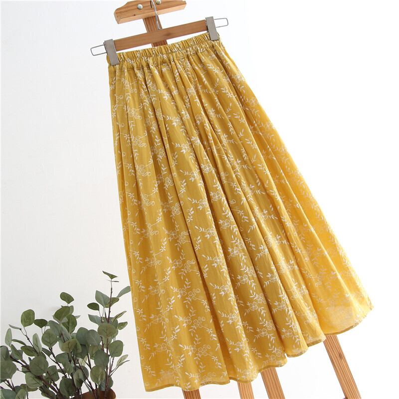 送料無料୨♥୧ スプリングサマーレディースイエロースカート ウェストフローラルプリーツミディ コットン 大人ガーリー スウィート キュート カジュアル 春物 夏物 花柄 ナチュラル 天然 AOS78899021557