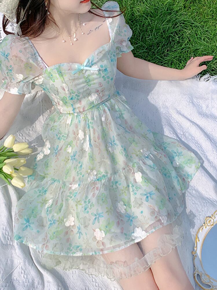 送料無料୨♥୧ サマーレディースミニドレス カラーグリーンフローラルプリント柄スリーブ刺繍フリル ラッフル 大人ガーリー スウィート キュート カジュアル 夏物 花柄 スクウェア AOS36335429412