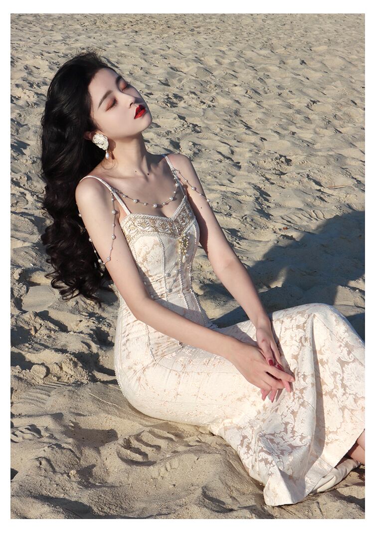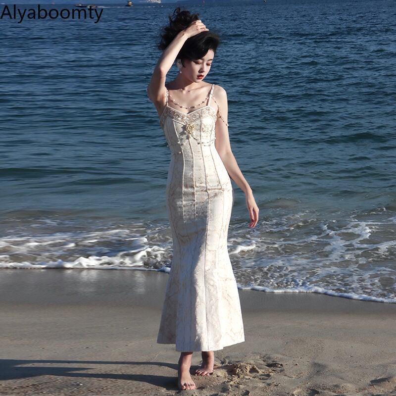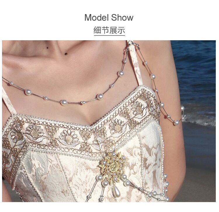 送料無料୨♥୧ サマーレディースロングドレス パールフリルバックレス ラッフル 夏物 真珠 AOS90388749250
