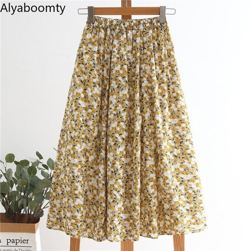 送料無料୨♥୧ サマーオータムレディースイエローミディスカート ヴィンテージフローラルプリント コットン エラスティック 伸縮 大人ガーリー スウィート キュート カジュアル 夏物 秋物 花柄 ビンテージ AOS59527116724