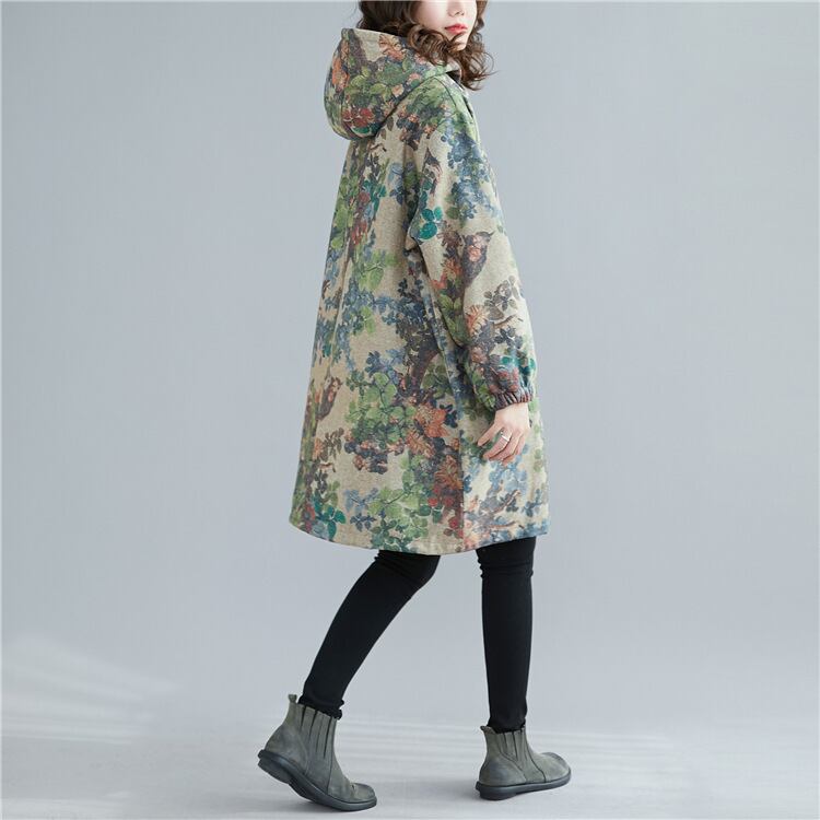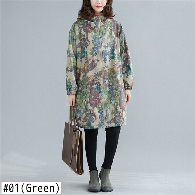送料無料୨♥୧ オータムウィンターレディースフードヴィンテージプリント柄グリーンフローラルジッパールーズバギーコート 秋物 冬物 花柄 ビンテージ AOS1239231248