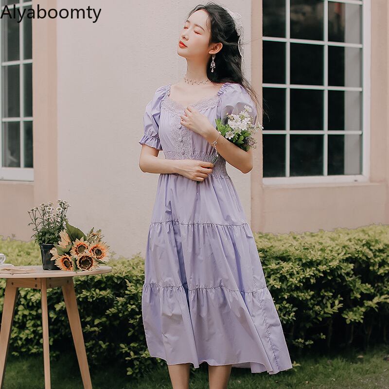 送料無料୨♥୧ サマーレディースミディドレス ホワイトレースパッチワークソリッド フリルロング ラッフル 大人ガーリー スウィート キュート カジュアル 夏物 ソリッドカラー パープル AOS58251751193