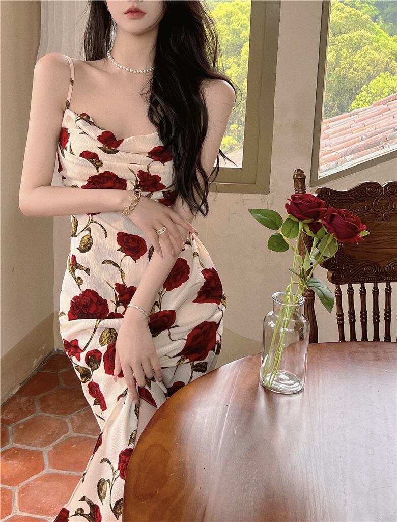 送料無料୨♥୧ サマーレディースロングAラインドレス プリント柄スリムヴィンテージミディフローラル 夏物 ビーチ 花柄 ビンテージ AOS59074504898