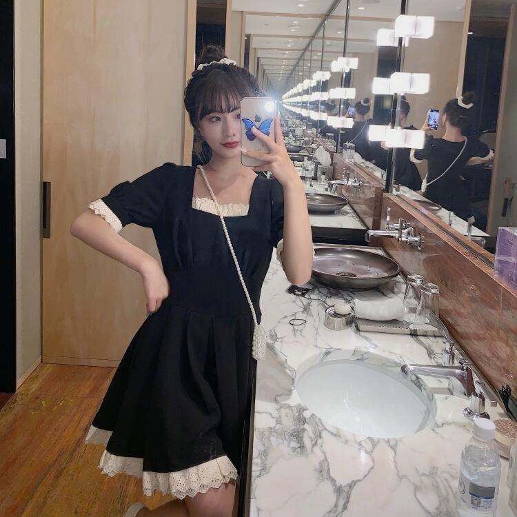 送料無料୨♥୧ サマーレディースブラックミニドレス カラーパッチワークレースフリルドレス ワンピース ラッフル 大人ガーリー スウィート キュート カジュアル かわいい 夏物 スクウェア AOS14755885447